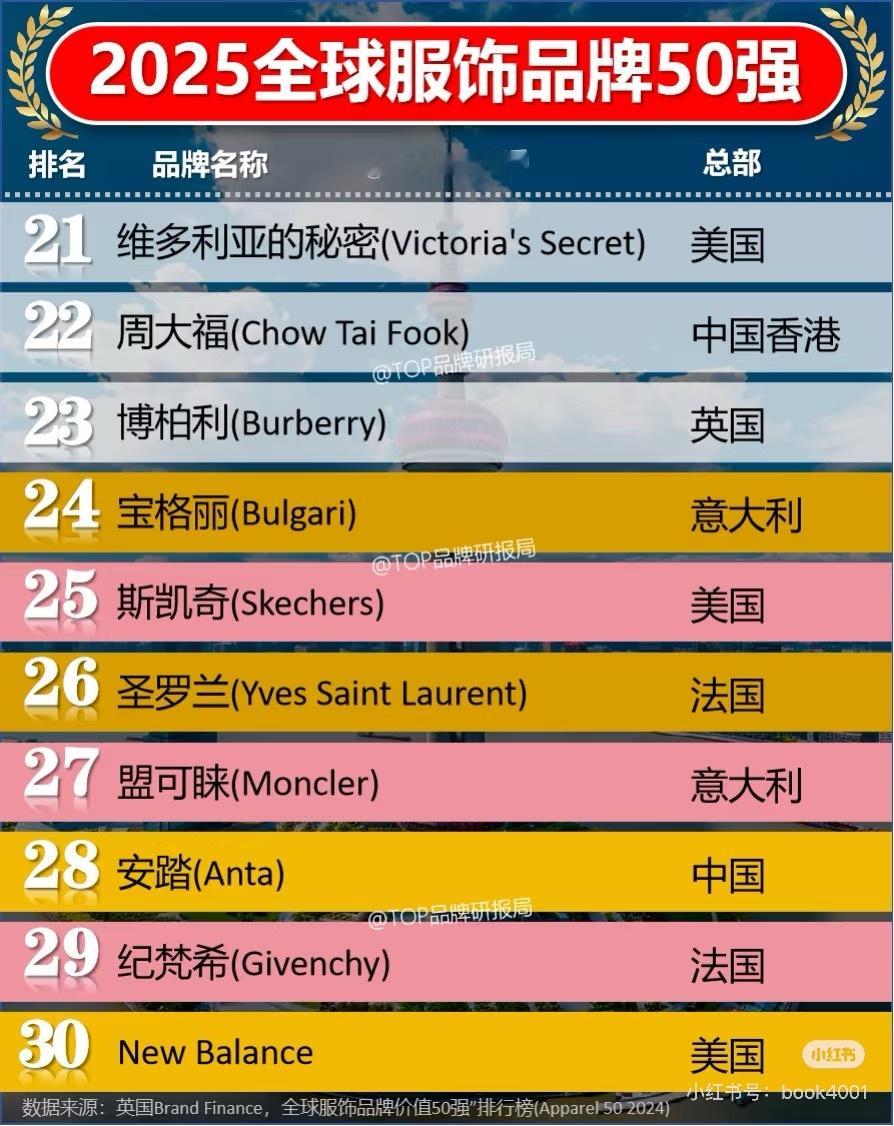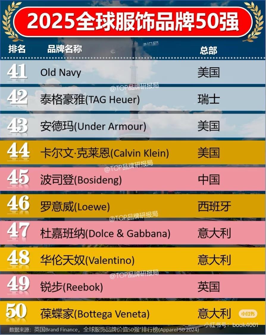 英国品牌评估机构“品牌金融”(Brand Finance)发布2025“全球服饰品牌价值50强”排行榜(Apparel 50 2024)。 ​​​