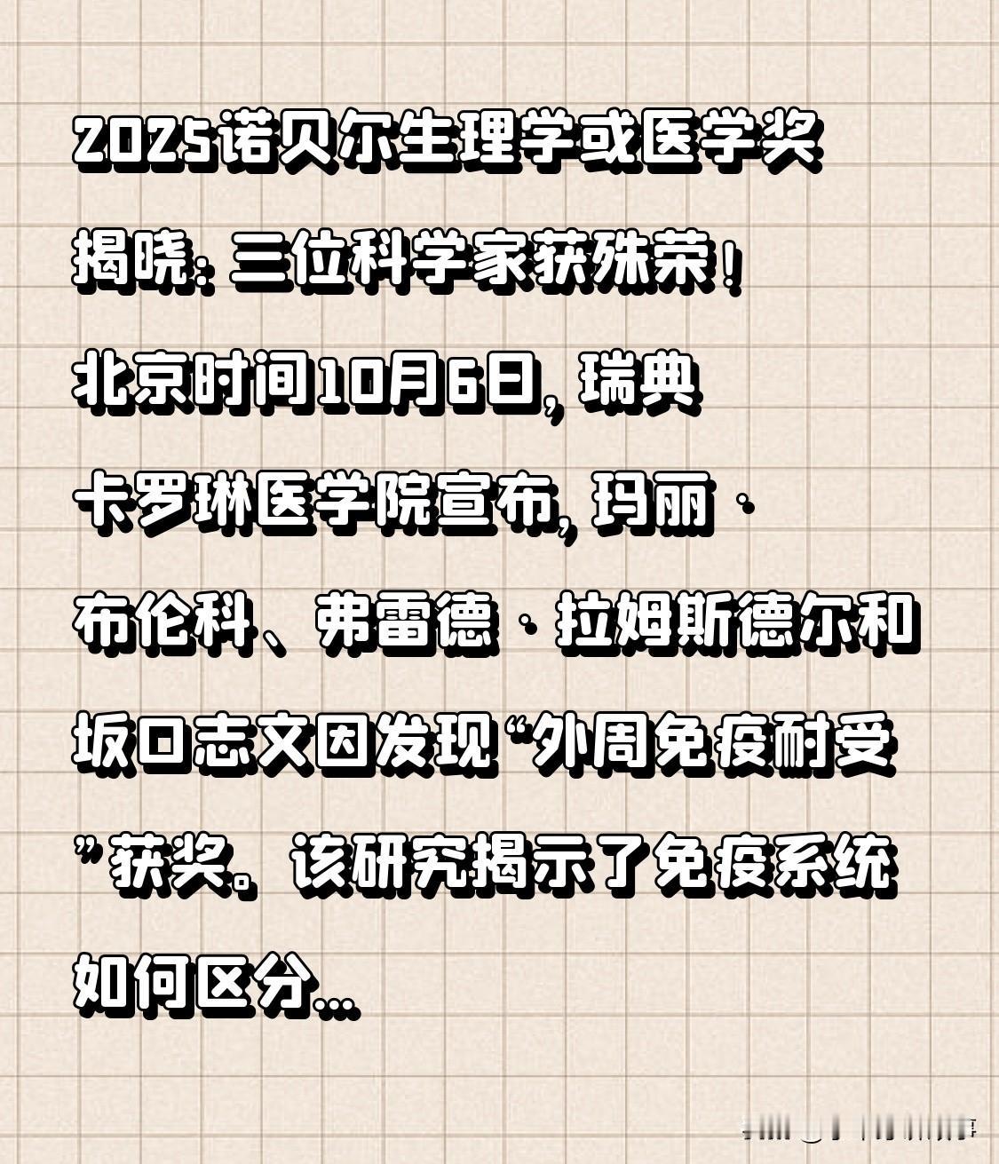 重磅!2025诺贝尔生理学或医学奖揭晓,三位科学家荣膺殊荣!🏅 北京时间10月6日,瑞典卡罗琳医学院公布,玛丽·布伦科、弗雷德·拉姆斯德尔和坂口志文因发现“外周免疫耐受”折桂。此研究揭示免疫系统辨别“敌我”机制,为自身免疫疾病治疗带来新思路。 此前,华裔科学家陈志坚(cGAS - STING通路发现者)和中国香港卢煜明教授(无创产前检测技术)是热门人选,虽未获奖,但科学探索永不止步!🚀 诺贝尔奖 诺贝尔文学奖