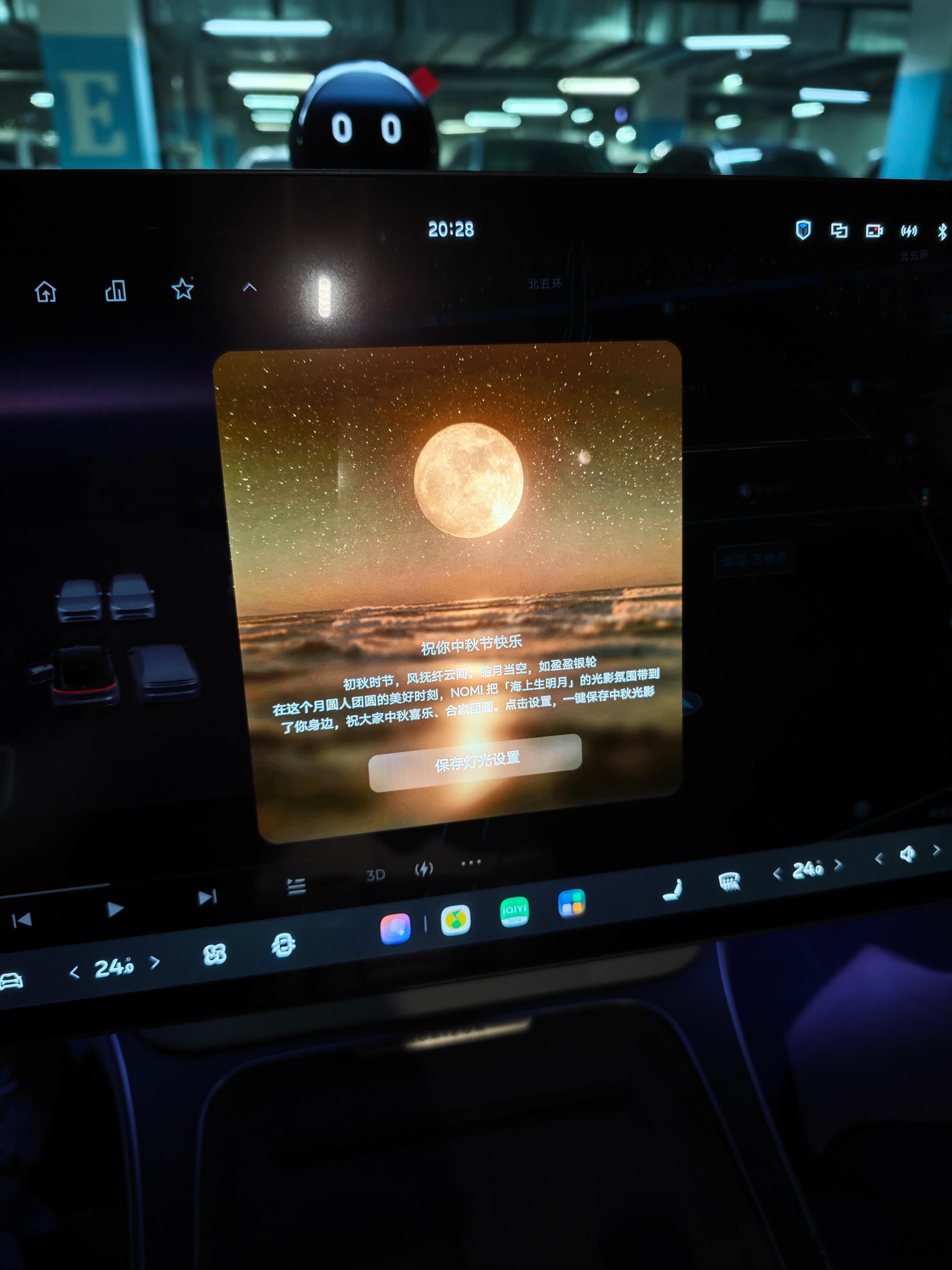 中秋节,刚到车里打开ET9发现推了一个小更新:用大灯投了一个赛博月亮,还是徐徐向前升起来的感觉,ET9的光毯功能也很完善,稍后给大家拍拍。