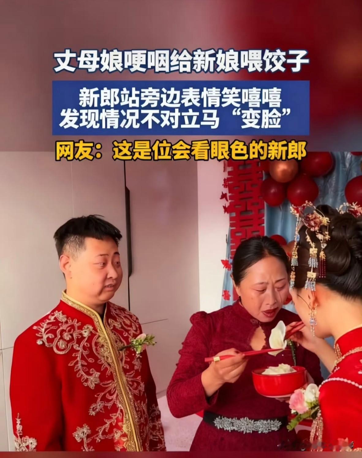 新郎这“变脸”速度,是懂事儿的! 婚礼现场,丈母娘端着碗,手都抖着给新娘喂饺子。新娘想笑,眼泪却在眼眶里打转,那眼神里全是对爸妈的舍不得。旁边新郎一开始还笑嘻嘻的,一看丈母娘和新娘快哭了,脸“唰”一下就变严肃了,那表情转换速度,网友都夸:“这新郎会看眼色!” 其实结婚这天,最难受的就是爸妈。养了二十多年的闺女,突然要成别人家的人了,喂个饺子都带着千般不舍。新郎这时候要是还没心没肺地笑,真有点不合适。他能马上察觉气氛,收起笑容,说明心里是真把媳妇的家人放在心上了。 婚姻不只是两个人的事儿,更是两个家庭的融合。新郎这“秒变脸”,变的是表情,藏的是对媳妇和岳父母的在意。希望以后也能一直这么有眼力见,把媳妇和她爸妈都疼着~
