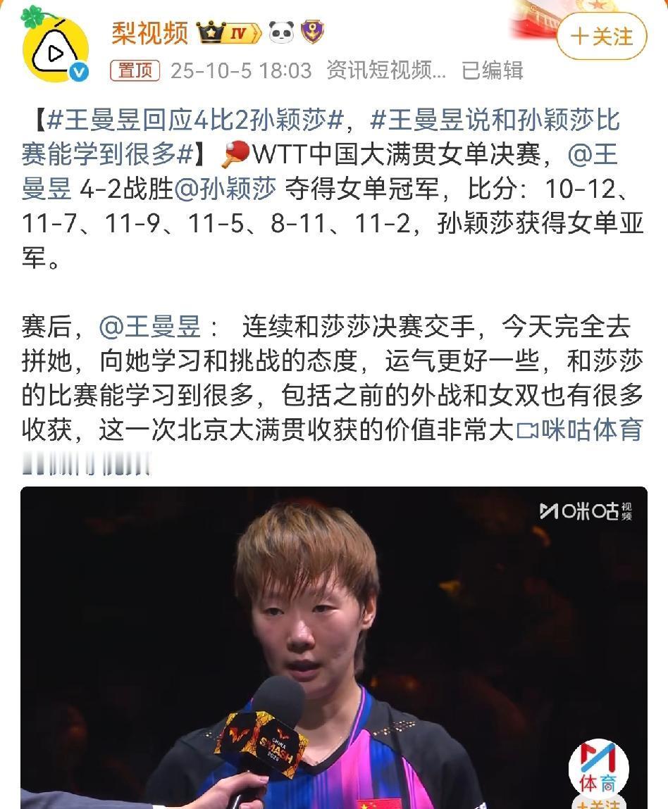 王曼昱赢了,六局打完,正手快带像开闸放水,74%的直线命中率,冠军荒419天,终于断了。 孙颖莎肩上贴着肌贴,外战21连胜还在,没输球,只是输了一场内战。 她微博就一句“亚锦赛见”,比啥都硬。 俩人刚在决赛拼到最后一分,转身就官宣双打合体。 教练说:奥运周期就三对能拿千分积分,她们是其一。 单打是对手,双打是队友,这事儿在国乒里,早就是日常。 10月14号,阿斯塔纳,她们又要一起上场。 日本那对年轻组合等着呢,中日青春对决,不用煽情,球拍一碰,就知道谁更狠。