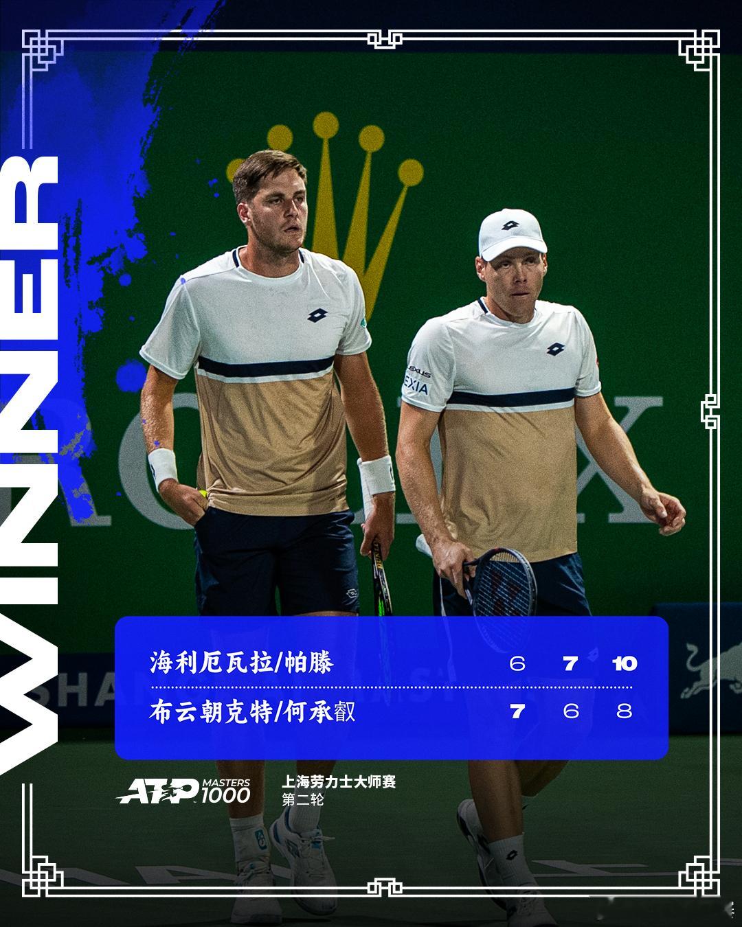 男双第二轮,持外卡出战的布云朝克特/何承叡错失一个赛点,以7-6(3) 6-7(4) 8-10不敌2号种子、中网冠军海利厄瓦拉/帕滕,遗憾无缘八强。