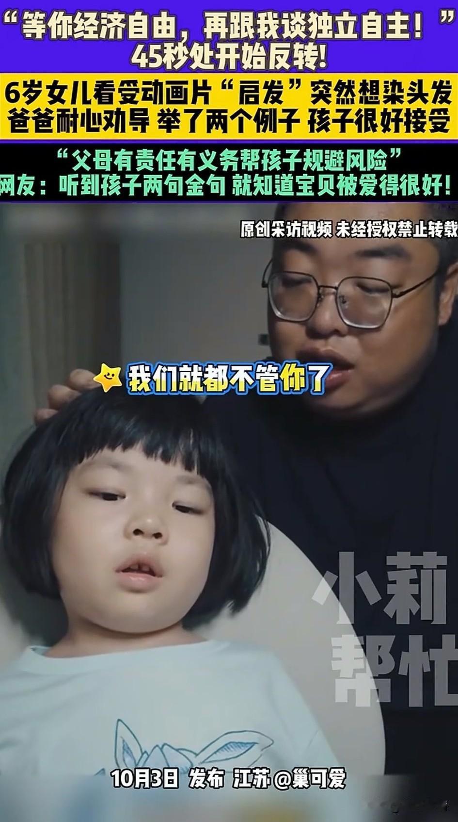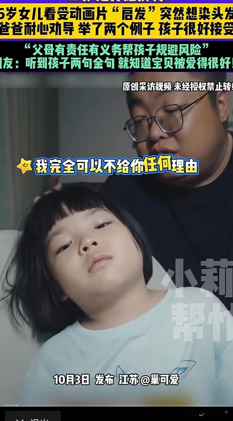 几岁的女孩对爸爸说我要染头发, 因为她看到动画片中各种头发很好看, 觉得很好玩就想也染头发, 她的爸爸没有大声训斥, 而是和她讲道理, 爸爸表示我不同意, 女儿说我的头发我做主, 老爸表示那从今天开始我们就不管你了, 女儿说不行, 爸爸说哪一天你的吃喝拉撒都不用我们管了,你自己挣钱了你想干啥我们就不管了,现在你还小需要听我们的, 对于你要染头发我完全可以不给你任何理由就反对, 小女孩也很聪明, 居然听懂了, 点头说我知道了! 这样的老爸教育孩子可以, 不发声呵斥耐心讲道理, 小孩子也可以理解, 网友表示听到孩子的两句金句, 就知道孩子被爱的很好! 大家对于爸爸给孩子讲道理怎么看? 聊聊孩子教育 染头发的女孩子 梳头发的小美妞 儿童女长发 家长不同意染发