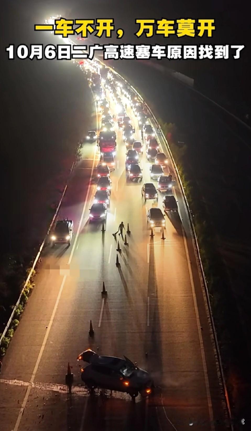 《二广高速堵车原因找到了! 10月6日的二广高速,堪称“堵车界的天花板”!一辆车横在路中央,直接让整条高速陷入瘫痪——车灯连成的“银河”里,满是返程人绝望的眼神。有人在车里从中秋吃到了国庆后(夸张脸),有人干脆在应急车道支起了麻将桌,这魔幻场面,离谱到让人想笑又心酸! 可回头想想,这“一车堵万车”的锅,到底是司机操作失误,还是高速管理的漏洞?你觉得这种极端堵车,是偶然意外,还是出行高峰下的必然隐患?