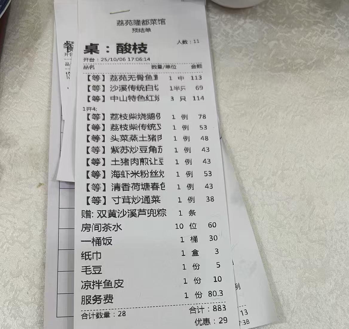 今天跟几个同事一起聚餐,共有四家人,坐了满满一大桌。 聚餐的地点是沙溪的隆都菜馆,它就在105国道的西侧,今天我是第一次去,进了它的大门后,发现它的面积真够大,停车场就有几处,吃饭的房间更是数不胜数! 最主要的是,我发现它的菜式很普通,感觉没啥特色菜,但是,菜的价格却是不含糊,该贵的真贵啊!例如无骨鱼粥114元,半只白切鸡69元,一只乳鸽38元,烧鹅例排78元,如果放在其的地方,菜的价钱真的没有这么贵,另外收10%的服务费,真的不值啊! [微风]