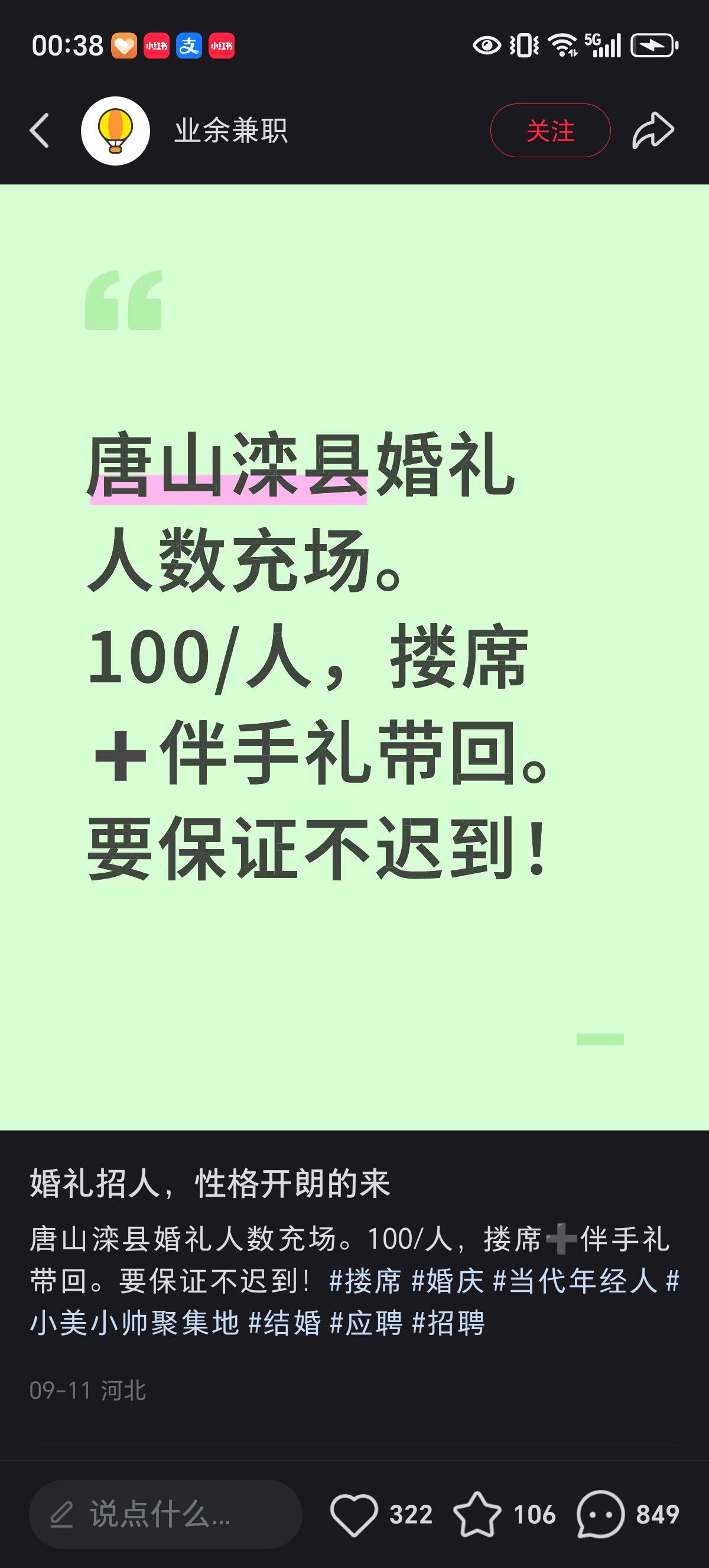 现在兼职还有职业搂席人了?这真是开了眼界了,有这种好事我也想去,不知道我住的地方附近有没有,得抓紧时间打听。 吃席不用随礼不说,还给钱,100/人呢,这种好事哪里找啊,这要是就在家附近的话,光吃饭不给工钱也可以考虑的。 我肯定能达到不迟到的要求,还可以提前一小时到场,我也在评论区问了,坐等回复,看看我住的地方有没有他们的分公司啥的。希望有,光给钱不吃饭也行的。