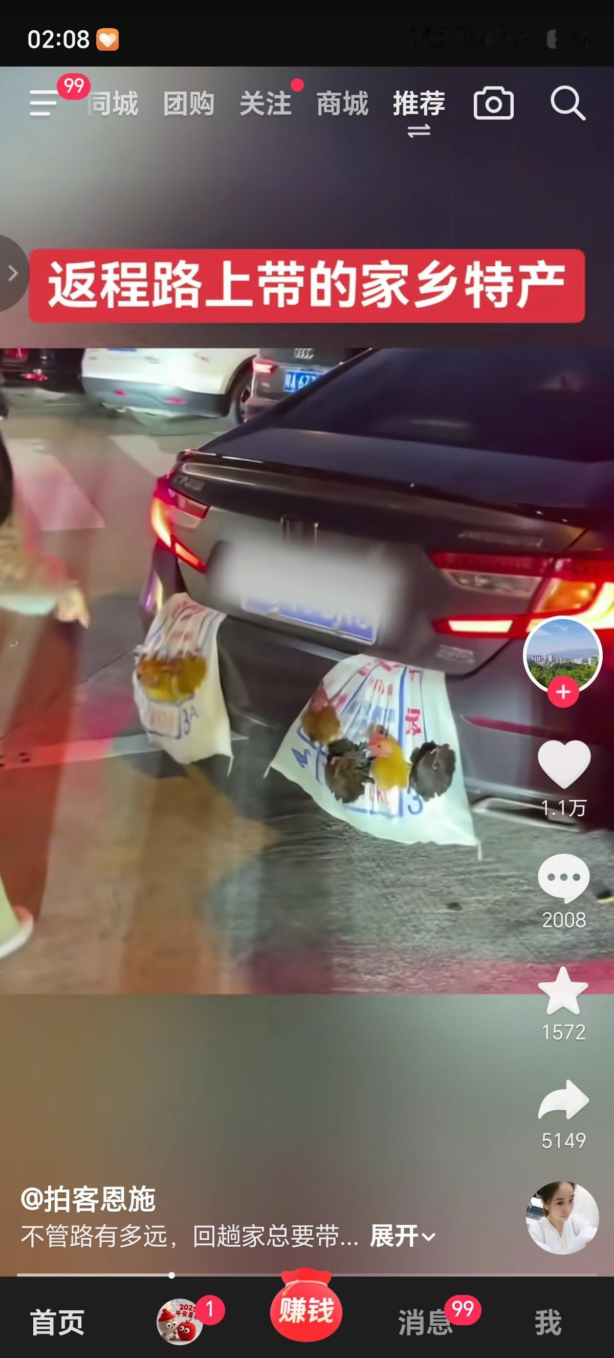 回家的土特产真丰富啊,鸡鸭鹅都有,都是活的,还挺多,鸭子都跑路了都没发现,车轮子跑丢了也没发现。 鸡鸭鹅也不杀好了拔毛带回家,这是留着下蛋吗?到家还得自己养着,会养吗?不扰民吗?这是把家里的鸡都带走了吧。