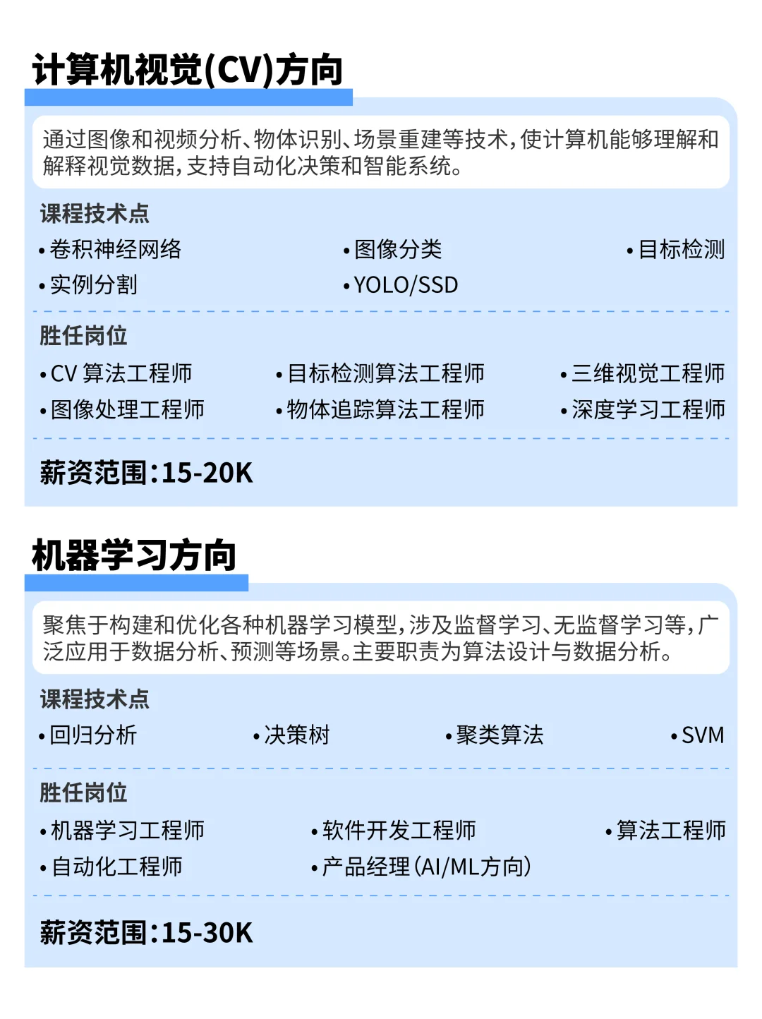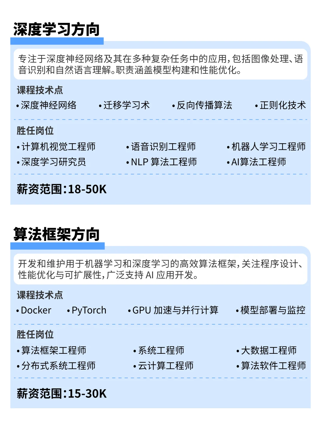 🔥人工智能专业 6 大就业方向,速看! 想进 AI 领域?这 6 个方向要了解👇 1️⃣大模型方向 研究超大规模深度学习模型,支持生成、文本理解等任务。 岗位:大模型应用开发、Prompt 工程师等 薪资:20-35K 2️⃣NLP 方向 处理文本数据,实现翻译、情感分析、聊天机器人等功能。 岗位:NLP 算法、智能客服工程师等 薪资:18-25K 3️⃣计算机视觉(CV)方向 通过图像 / 视频分析,让计算机理解视觉数据,支撑智能系统。 岗位:CV 算法、图像处理工程师等 薪资:15-20K 4️⃣机器学习方向 构建优化各类机器学习模型,应用于数据分析、预测等场景。 岗位:机器学习、算法工程师等 薪资:15-30K 5️⃣深度学习方向 用深度神经网络做图像处理、语音识别等复杂任务,优化模型性能。 岗位:计算机视觉、深度学习研究员等 薪资:18-50K 6️⃣算法框架方向 开发维护高效算法框架,支持 AI 应用开发,关注性能与扩展性。 岗位:算法框架、云计算工程师等 薪资:15-30K