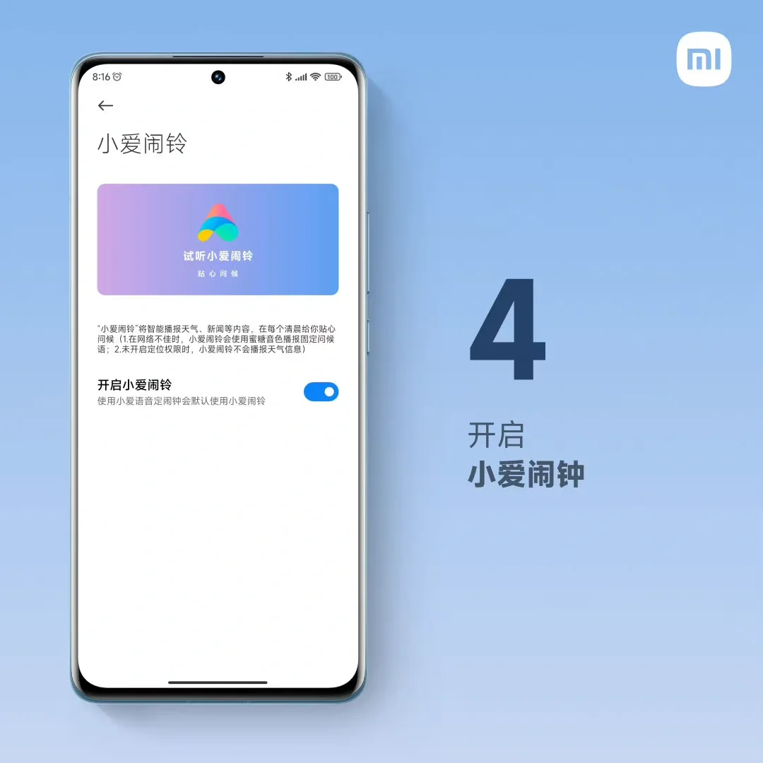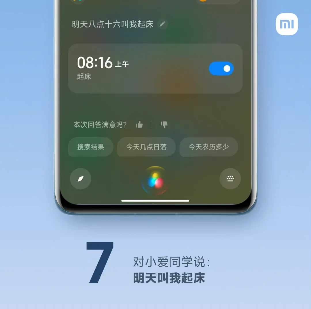 对小爱同学说「明天8点16叫我起床」,用语音定闹钟,小爱同学就会用你喜欢的音色叫你起床啦。[酷]