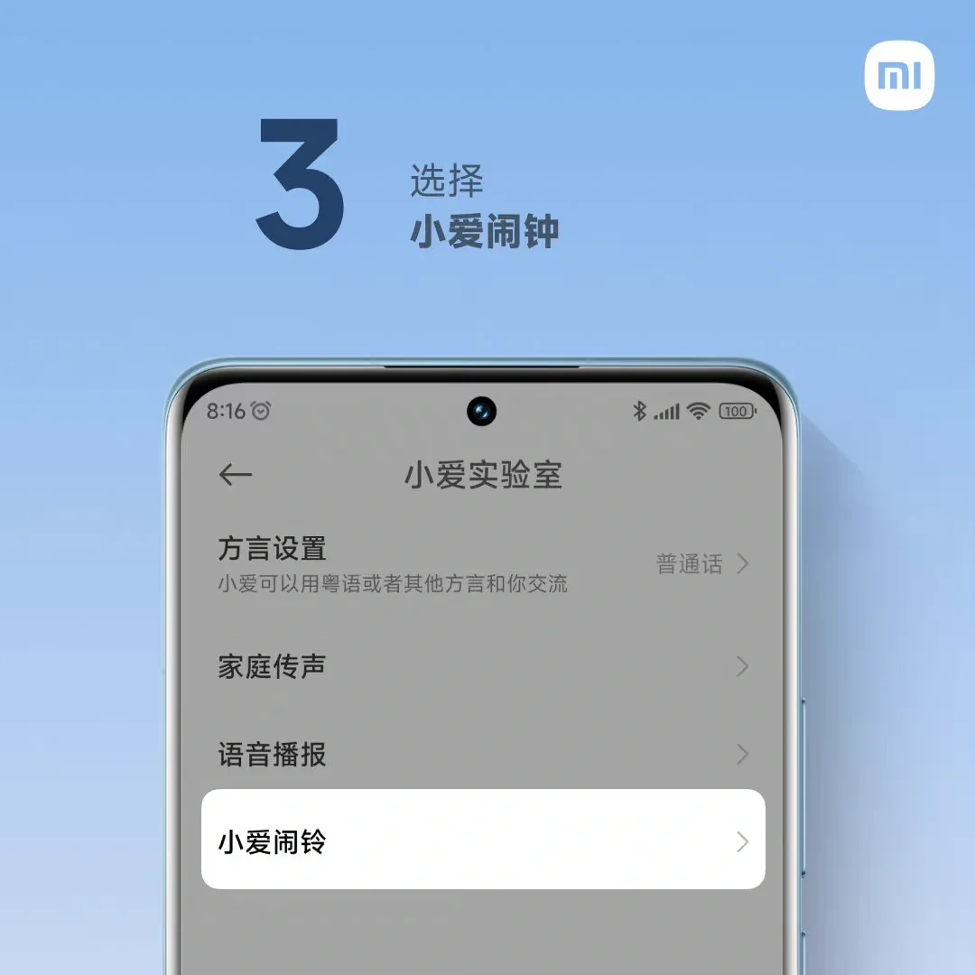 通过 设置 > 小爱同学 > 小爱实验室 ,开启小爱闹铃。