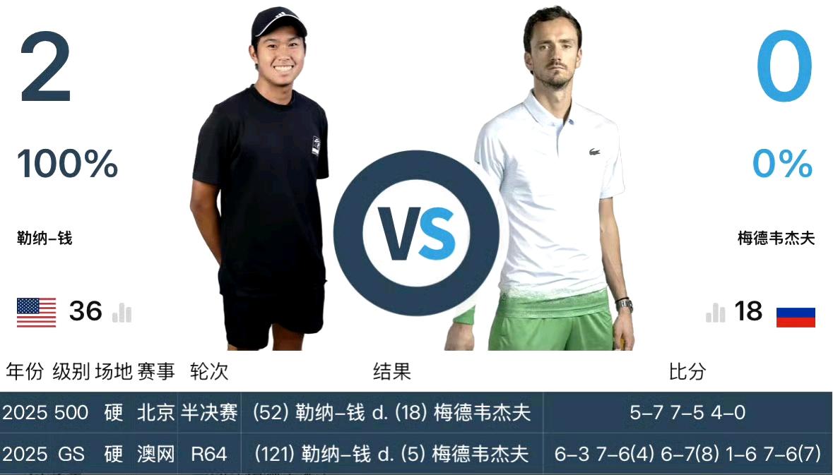 勒纳·钱又赢了!历时19天,转战三城,连打11场比赛,不仅毫无疲态,甚至越战越勇! 钱同学,年仅19岁,纯亚裔基因,身高不过180,体型看来并不粗壮,还带点婴儿肥,他的体能真有点深不见底。 职业生涯首次参加中国赛季,第一周在杭州打进八强;转战中网又连胜四位top30,拿到亚军,冠军辛纳昨天已在上海大师赛退赛。 来到2025上海大师赛,在人见人怕的地狱级天气里,前两轮分别在先丢一盘后逆转凯兹曼诺维奇和穆泰,昨天又直落两盘击败诺里晋级。 接下来将再次对阵梅总,前两次(澳网、中网)钱学生都磨赢了。