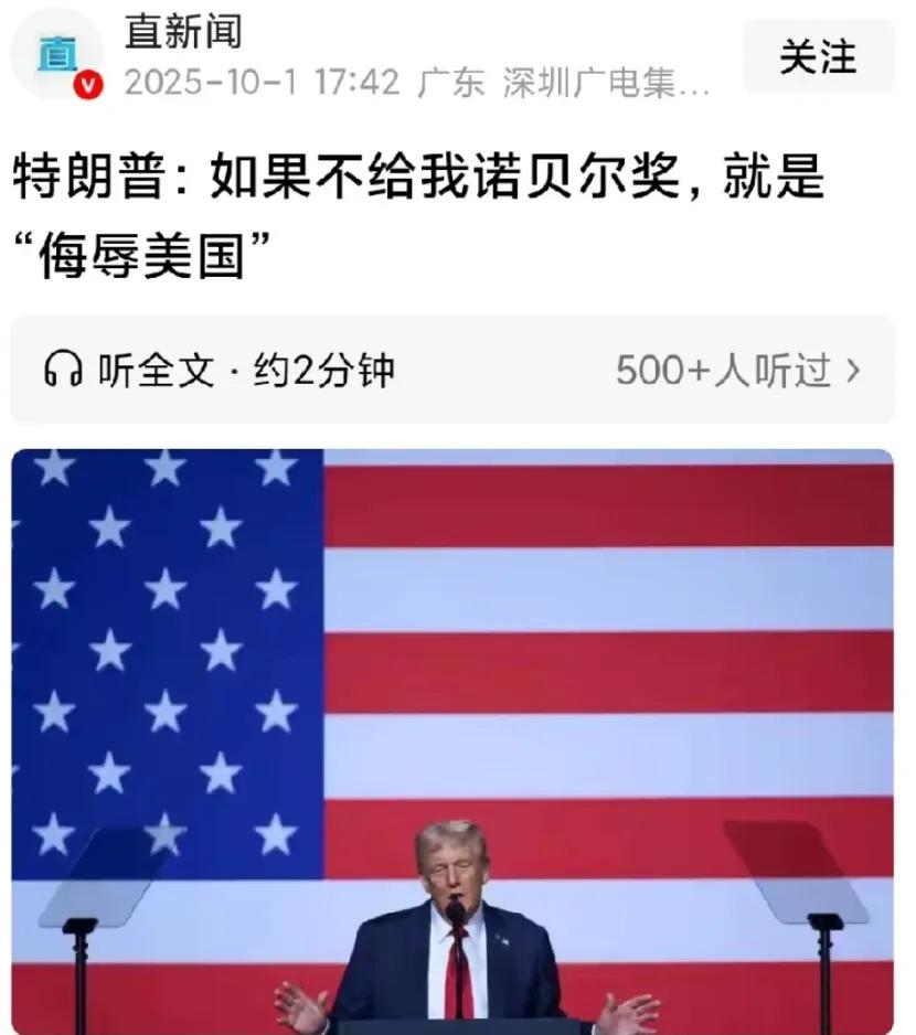 “活出个样来给自己看……”——不,特朗普是直接打电话向挪威要诺贝尔和平奖“要给自己玩”:如果不给我诺贝尔奖,“就是侮辱美国”。这算什么?特朗普要是用要拿下巴拿马运河和格林兰岛那样威胁拿下挪威也是他的风格,能理解,也叫那么回事,但把美国搬出来就有点扯了。不给他诺奖怎么就侮辱美国啦?跟美国有半毛钱关系吗?为了自己拿美国压挪威?太不要脸了吧? 也是,特朗普什么时候要过脸?得奖也是得的不要脸奖。有外媒认为他获奖机会渺茫,10月10日就是和平奖颁布的日子,若是他当选,侮辱的是美国,不是他,美国没事,侮辱的是他自己。