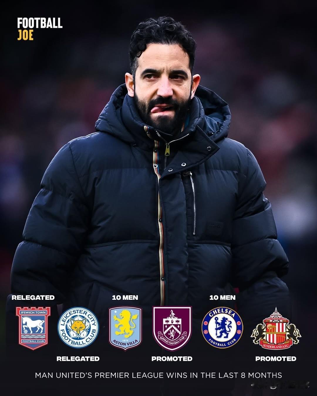 曼联在过去八个月里仅赢得了六场英超比赛,而且所有这些胜利的对手要么是升班马或降级的球队,要么就是人数处于劣势的球队(10人应战) • 3-0 莱斯特城(已降级) • 3-2 伊普斯维奇(已降级) • 2-0 阿斯顿维拉(10人应战) • 3-2 伯恩利(升班马) • 2-1 切尔西(10人应战) • 2-0 桑德兰(升班马)