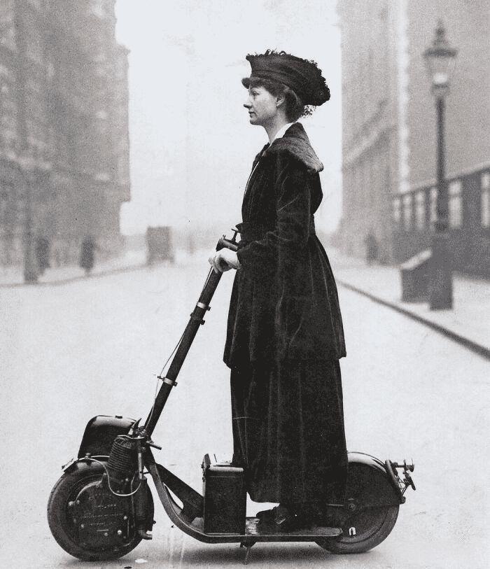 1916年的伦敦街道,雾气给深灰色砖石建筑蒙上一层朦胧纱幔,画面中央,英国社会名流与女权主义者诺曼夫人立于Autoped公司制造的电动滑板车之上。她身着天鹅绒长裙,裙摆如流水般垂坠,头戴黑色宽檐帽,衬得侧脸轮廓优雅又坚定。