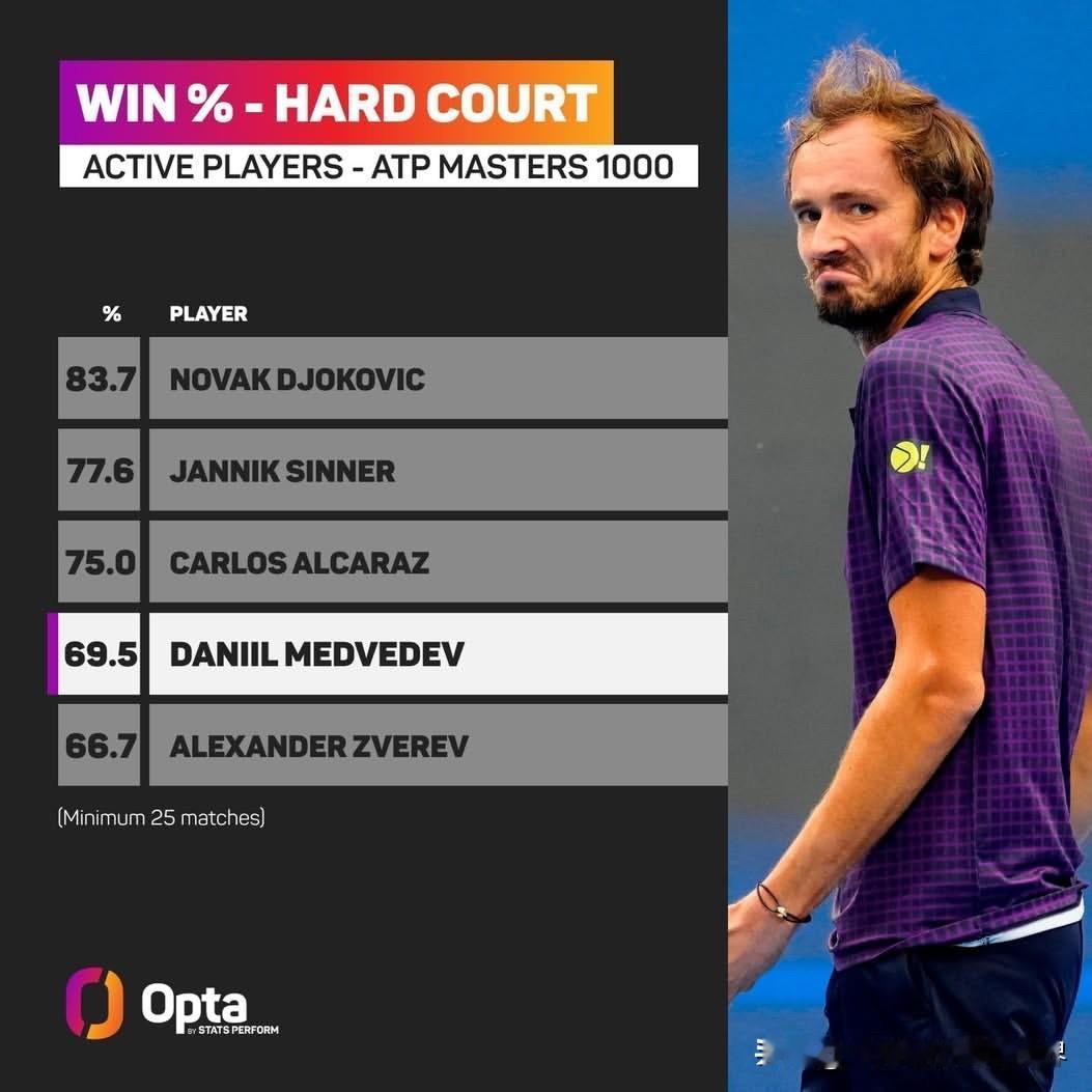 ATP现役球员硬地大师赛胜率排行前五位(至少25场比赛): 1、🇷🇸诺瓦克·德约科维奇83.7 2、🇮🇹扬尼克·辛纳77.6 3、🇪🇸卡洛斯·阿尔卡拉斯75.0 4、🇷🇺丹尼尔·梅德韦杰夫69.5 5、🇩🇪亚历山大·兹维列夫66.7 在现役球员中,德约科维奇硬地大师赛胜率最高,达到了83.7%,名副其实的硬地之王。