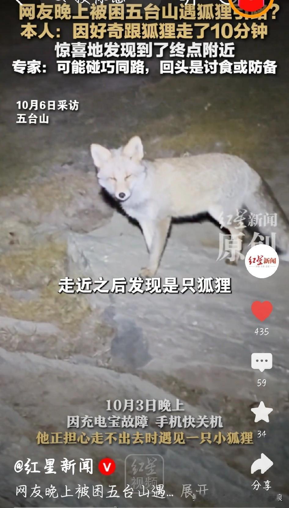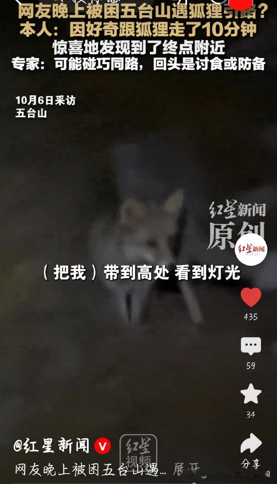 五台山这事儿太神了!陈先生晚上徒步被困,手机快没电,四周乌漆嘛黑,正慌得不行,突然冒出只小狐狸。 他本来还怕,结果狐狸走两步就回头等他,跟着走了10分钟,居然直接到了终点附近,一眼就看见鸿门岩的灯光了。陈先生说当时鸡皮疙瘩都起来了,直呼“它真在给我带路”。 有人说这是五台山狐仙显灵,毕竟这儿早有狐狸通灵性的传说。不过专家解释,可能是狐狸活动路线刚好重合,回头是想讨食或防备。 不管是巧合还是缘分,这波“山中奇遇”也太暖心了!男子被困五台山遇狐狸“引路” 五台山 五台山菩萨道场