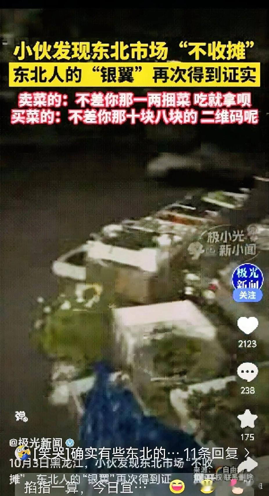 “太有意思了!”黑龙江,一男子发现某菜市场各摊位晚上没人看守,称:不怕人偷吗?网友直呼:刷新我对东北的认知………… 这事儿听起来确实有点不可思议。大晚上的,菜市场各摊位就这么摆着,没人看管,难道真的不怕被偷吗?这和我们平时听到的一些地方水果摊被哄抢的新闻比起来,反差实在太大了。但仔细想想,这种看似“反常”的现象背后,其实藏着东北社会生态的深层逻辑。 信任,是这里无形的围墙。这种夜不守摊的景象,很大程度上源于一种长期形成的社区信任和自觉。当大多数人都遵守着“不是自己的东西不拿”这条简单底线时,市场的秩序就不再需要靠铁锁和专人看守来维持。这有点像我们常说的“破窗效应”的反向应用——当一扇窗户一直完好,大家都会下意识地去共同维护它。在这样环境里,随手顺走一箱水果的“第一个老头”很难出现,因为那种行为会立刻被周遭的共识所不容。 当然,这种安全感并非凭空而来。它和整体治安环境的改善息息相关。就像官方发布的数据显示,黑龙江省的群众安全感在不断提升,“八类案件”的破案率也创新高。日常生活中,保安、民警的巡逻守护,以及社区管理的细致入微,都为这种信任打下了坚实基础。可以说,是“人努力”与“天帮忙”共同作用的结果——“天”指的是这片土地上逐渐形成的良好风气。 不过,咱们也得冷静看待这件事。千万别把这种个别现象简单放大为整个东北的普遍标签。这个菜市场的个案确实温暖人心,但现实中,很多地方的农贸市场依然面临着脏乱差、管理不善等老问题。就像哈尔滨道外区一机路市场被曝光的卫生堪忧、乱堆乱放等现象,提醒我们城市管理仍有很长的路要走。同时,流动摊位的食品安全与占道经营问题,也在考验着管理者的智慧。这个“夜不闭户”的市场更像是一个值得追求的标杆,而不是东北日常的全景图。 我们需要思考的是,如何让这个菜市场的美好个案,变成更多地方可以复制的常态。这需要市场方有担当,更需要我们每个市民的自觉维护。毕竟,一个让人安心的“菜篮子”,光靠几个监控摄像头是远远不够的,它根植于我们每个人对规则的敬畏和对彼此的信任。 各位读者你们怎么看?欢迎在评论区讨论。