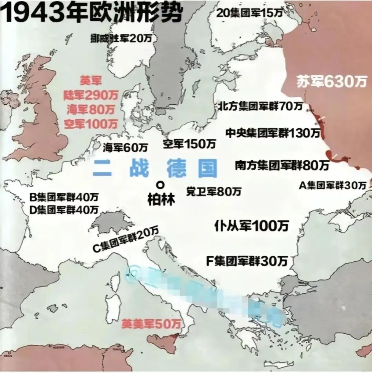 二战时,德国没提前搞总动员,又没能快速打垮苏联,其实已经没什么赢的希望了。 到1943年,局势对德国更是不利。美国和英国这时候早就完成了战争动员,每天动不动就派上千架轰炸机对德国本土展开战略轰炸,海上还把德国的航线封得死死的,同时又攒出几百万装备齐整的机械化部队,就等着找机会在欧洲登陆。 同一时期,英美对苏联的援助也没断过,小到步枪弹药、无线电零件,大到坦克、卡车和战斗机,甚至连过冬的棉衣、罐头食品都大批量输送,这些物资直接帮苏联补上了前线的装备和补给缺口。 而苏联即便前期损失惨重,剩下的一亿多人口也没那么容易打光,不管前线怎么消耗,后续兵力和物资总能补上来。 这一年德国的兵力分配更是捉襟见肘,东线要硬扛苏联的反攻,部署了近300万兵力,几乎占了陆军总兵力的60%,但装备和补给跟不上,不少部队连足额的坦克和火炮都凑不齐; 西线还要留着约100万兵力防备英美登陆,同时还要应对本土轰炸后的防御和抢修,兵力被拆得七零八落,没法集中力量突破任何一边,这种局面下,赢的可能基本不存在。