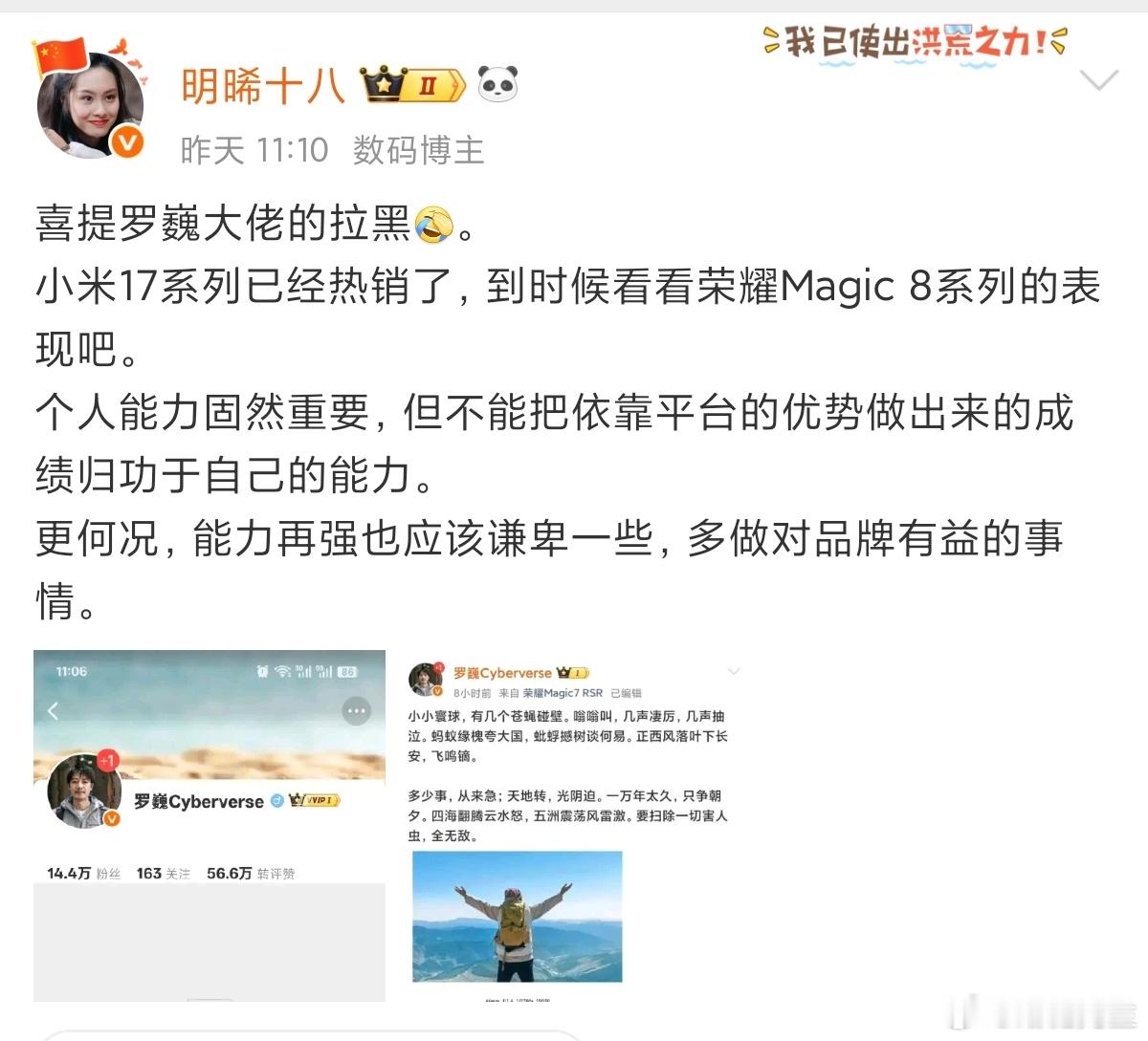 荣耀手机影像负责人大战数码圈,霸气拉黑多名大V。