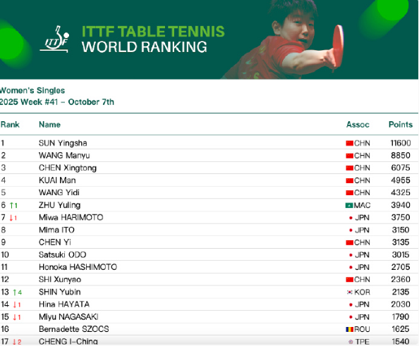 女单TOP10: 孙颖莎🇨🇳:11600分; 王曼昱🇨🇳:8850分; 陈幸同🇨🇳:6075分; 蒯曼🇨🇳:4955分; 王艺迪🇨🇳:4325分; 朱雨玲🇲🇴:3940分; 张本美和🇯🇵:3750分; 伊藤美诚🇯🇵:3150分; 陈熠🇨🇳:3135分; 大藤沙月🇯🇵:3015分