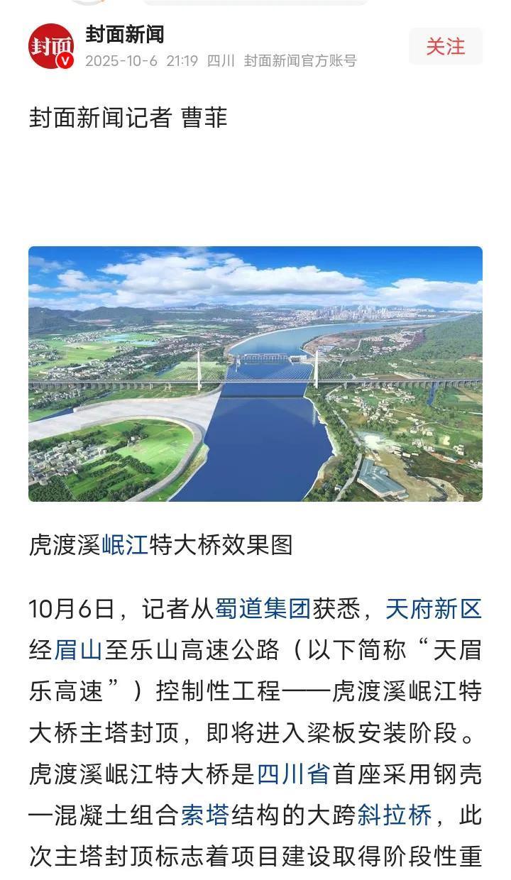 好消息,成都来往乐山的第二条直达高速天眉乐高速全线控制性工程全长约4.2公里的虎