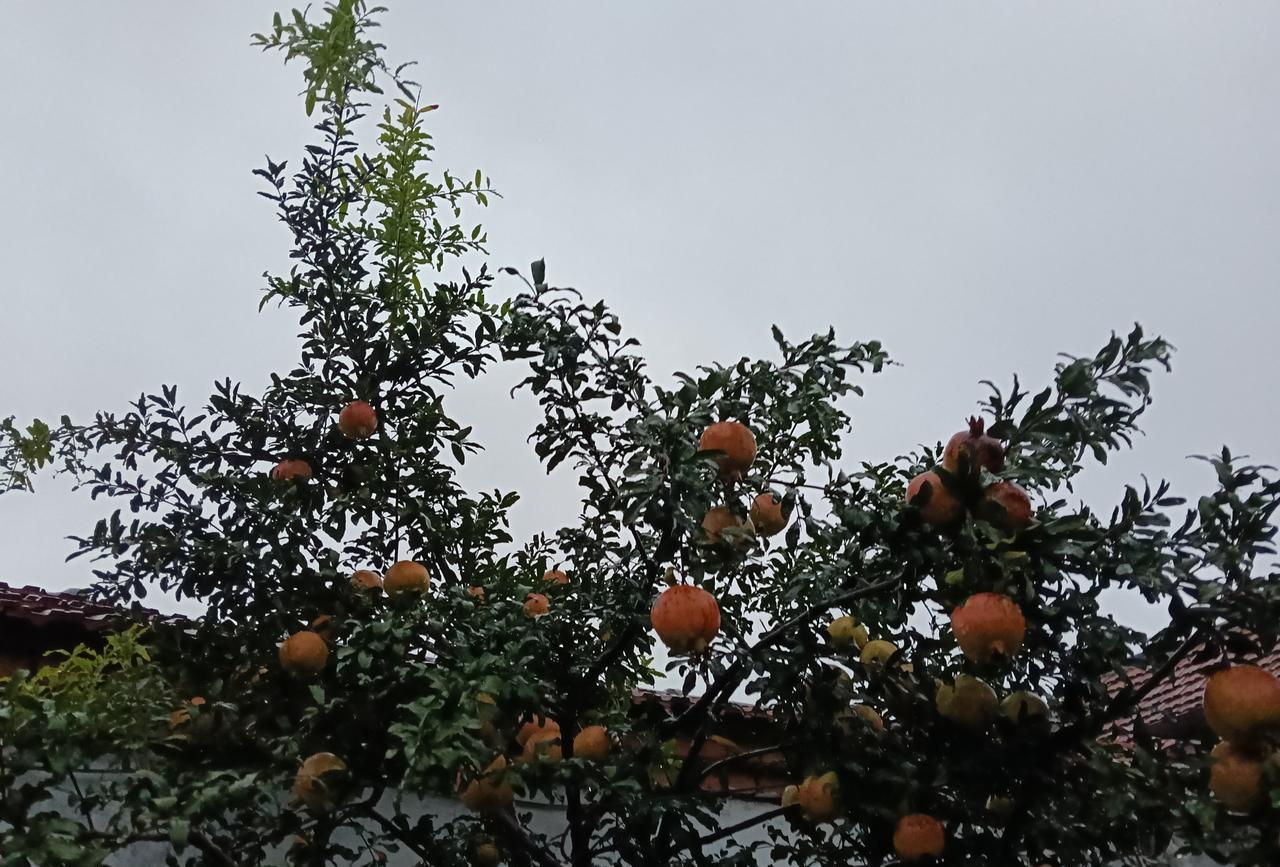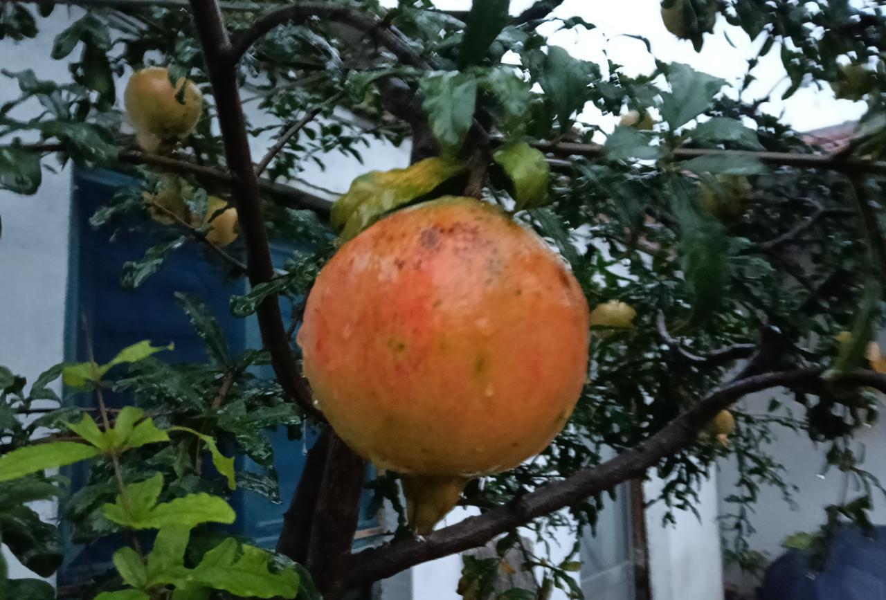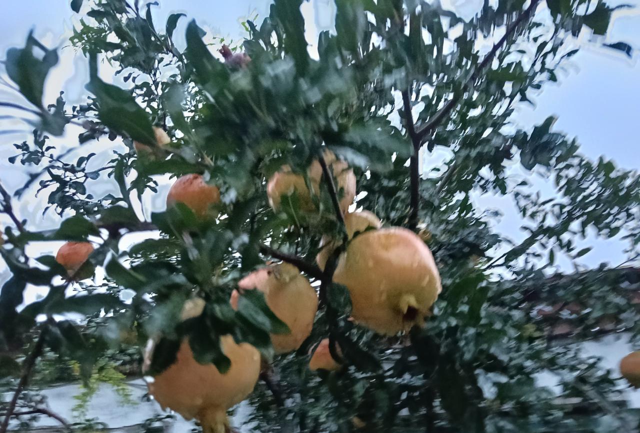 秋天雨中的石榴, 这个秋天是个多雨的季节, 石榴在风雨中摇摆。 石榴经历了春天的滋养,夏天的暴晒, 又经历了秋天的凉爽,马上就快成熟了。 秋天的石榴热情似火, 在风雨中显得那样的晶莹。 我喜欢秋天,更喜欢秋天的石榴!