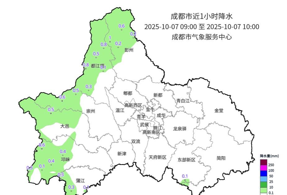 过去一个小时,成都市西部山区出现了零星的小雨,正在西部山区游玩的朋友们注意安全!