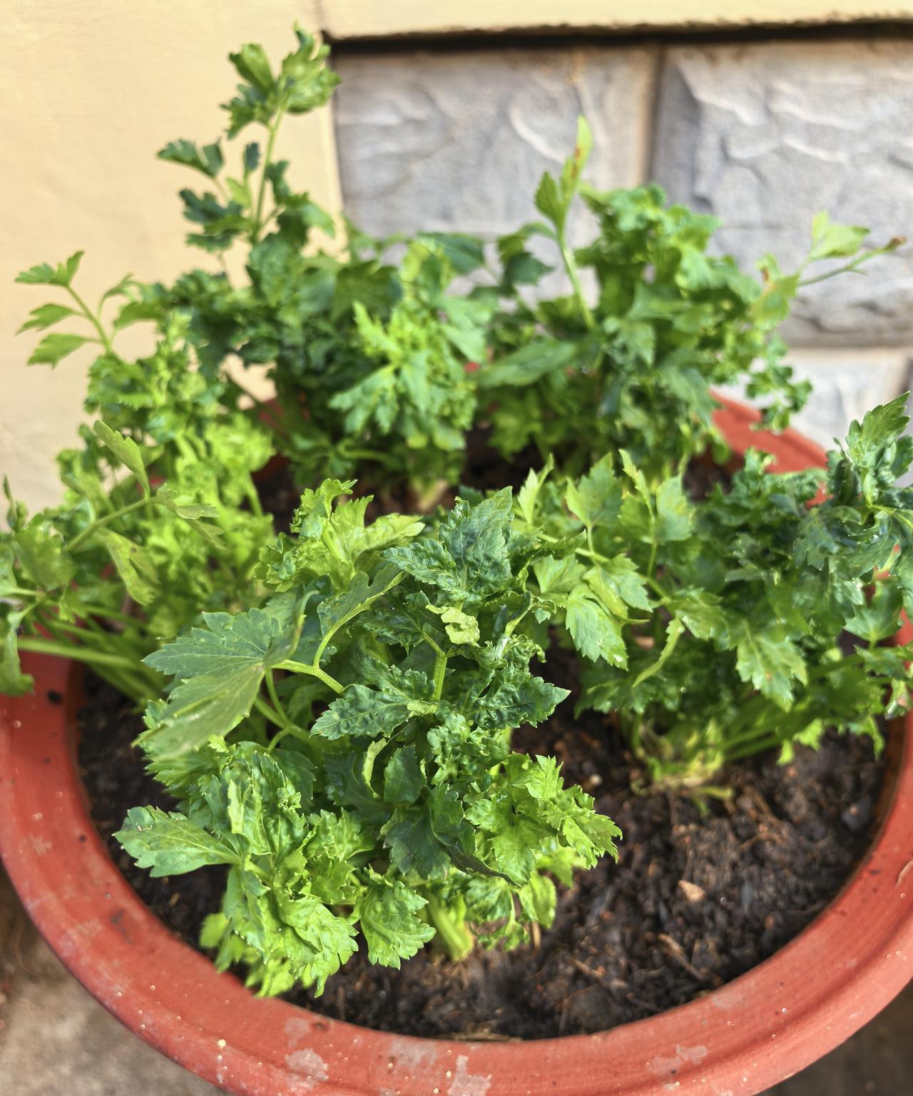 好像活了!盆栽的5棵芹菜根,已经是第3天了,早晨为它补水,用剪刀修剪残根老叶,观察有新叶子发出。 清扫师傅说“挺能琢磨的,栽培标准,见新叶,说明活了。”他说的我信,他农民出身,我不懂得地方常向他请教,帮我拎水拌土拌肥,搬不动的求他帮忙。他还告诉我,“气温下降到零度喊他一声,帮我将花盆芹菜搬进楼里阳台上,一个月可收获一茬芹菜。” 产生盆栽芹菜的想法时间不长,缘于它的味道特别香,一问农民朋友,知道它是“空心”的,强过超市卖的实心芹菜。带回来5棵,掰去稍长的芹菜叶(见图片5),留下嫩芽,带点原土,栽在大盆里。栽种之前一周拌的盆土,土中拌入发酵一年多的鹿粪,还有农村拉回来的田园黑土,加少量沙子,应该说相当肥沃。 目前气温虽说晚间达个位数了3-6度,但白天不低,只要不冻冰,我仍然放室外靠院墙根处。