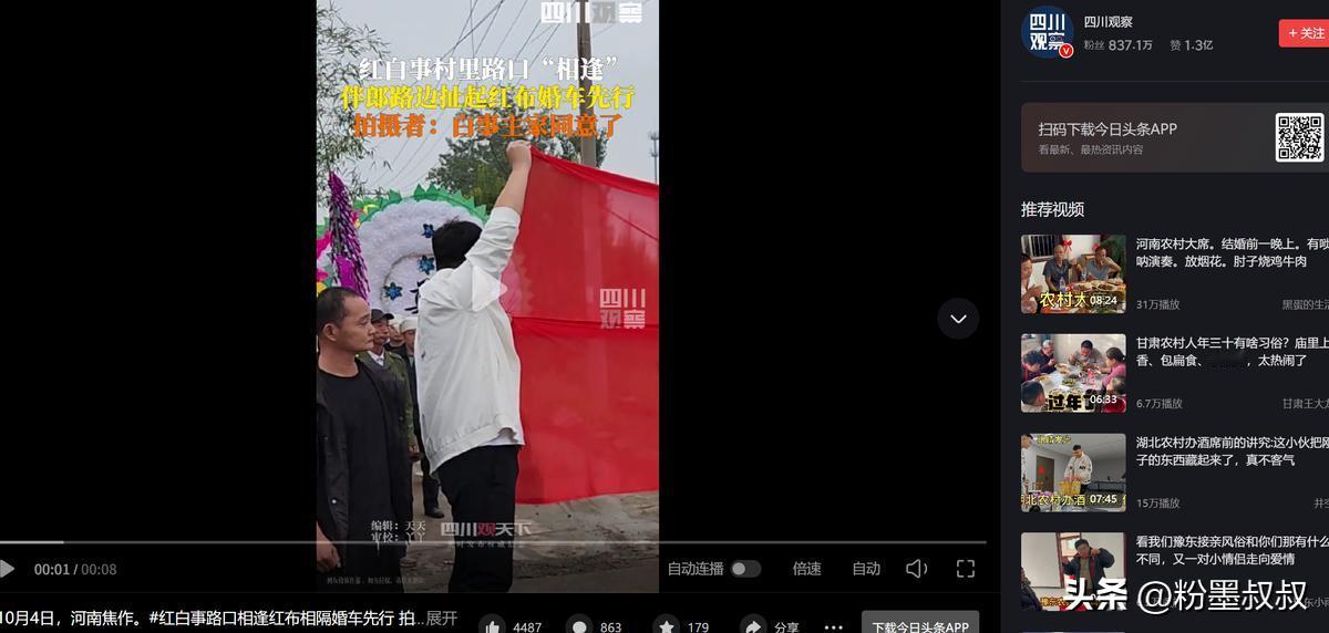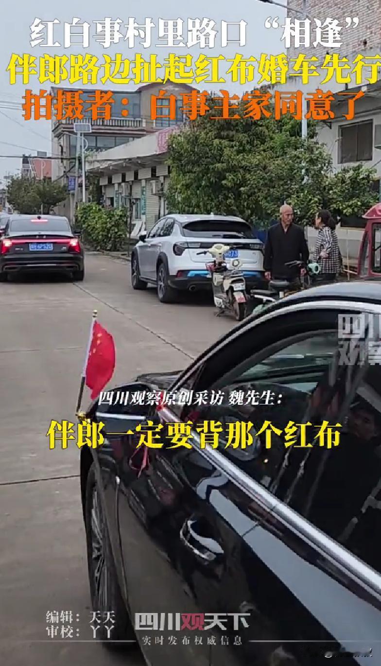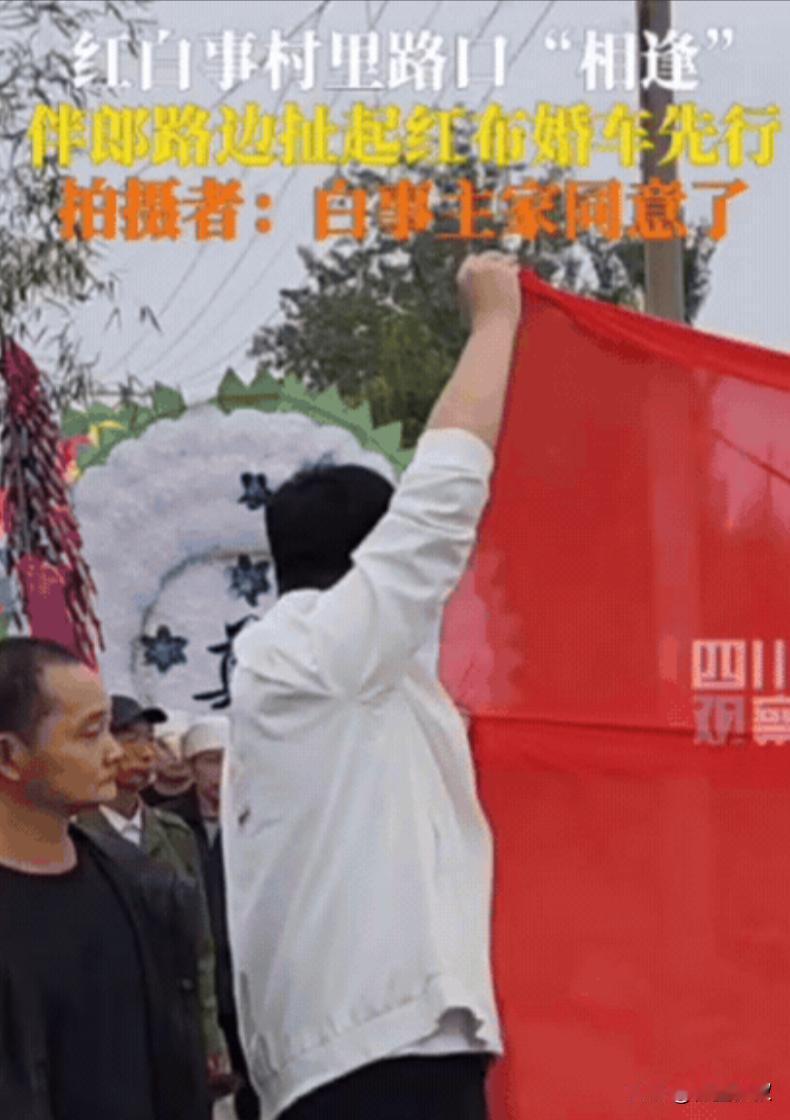 河南一结婚车队经过村路口,竟然碰到白事队伍挡路!伴郎立马下车,拿出一张红布遮住白事队伍,让婚车先行,对此白事主家也很善解人意,不仅没计较,反而主动让队伍靠边,拍摄者:按当地习俗,伴郎随身都带有红布,结局皆大欢喜! 前阵子河南焦作一个村子里的事儿,刷到的人几乎都夸 “这处理得太敞亮,看着心里暖”,那天村里的窄路本是喜气洋洋的,一队婚车正慢慢开着,车顶飘着红气球,车窗贴满 “喜” 字,车里的喜乐声飘得老远,连路边坐着晒太阳的老人都笑着探头看,知道是邻村谁家孩子娶媳妇。 可没等婚车队拐过第三个弯,前头突然就停住了,气氛一下就沉了,路那头一支白事队伍正缓缓往前走,零星的纸钱飘在地上,两边一下就堵死了。 那村子的路本就不宽,平时两辆车错车都得小心翼翼,这会儿婚车队排了四五辆,白事队伍这边也有不少人,还有拉着祭品的小推车,两边一碰头彻底没法动。 婚车上的鞭炮停了喜乐也关了,司机们都探出头张望,白事队伍那头,主事的是个五十来岁的大叔,眉头皱着也在原地打转,一边是一辈子的婚事耽误不得吉时,一边是送老人最后一程,也容不得马虎堵在这儿,谁心里都不是滋味,空气里都透着尴尬。 就在这僵着的时候,婚车副驾突然下来个小伙子,是伴郎穿得笔挺,却一点不慌,他伸手从外套内袋里摸出个东西,展开一看是块红布,不算大但红得鲜亮。 后来看视频的人才知道,按当地的老规矩,伴郎随身都会带块红布,就是怕遇到这种特殊情况,既是图个吉利避忌,也是给对方递个尊重的信号,那伴郎没急着往前冲,而是慢步走到白事主事的大叔跟前,客客气气地站定,把红布轻轻展开,递了个礼貌的眼神。 大叔一开始还皱着眉,看见红布的瞬间愣了一下,跟着眉头就舒展开了,甚至轻轻点了点头,他懂这意思不是婚车队要硬抢路,是带着诚意来的,这块红布就是 “我们懂规矩,也尊重您这边” 的意思。 大叔没多啰嗦,回头就朝身边的人喊:“来大伙儿往田埂边挪挪,把路腾开点!人家娶媳妇是大喜事,别耽误了吉时,咱这边慢两步不碍事!” 旁边的人也都明白,赶紧扶着年纪大的亲属,把小推车往路边的土坡上靠,连手里捧着的东西都小心收了收,就怕挡着婚车的道。 伴郎见大叔这么通情达理,赶紧回头朝婚车队摆手,还对着大叔深深鞠了个躬,婚车慢慢往前开,第一辆车上的新郎也从车窗探出头,让伴郎递过去两盒喜烟,要塞给大叔和旁边帮忙的人。 大叔没推辞接了烟揣进兜里,等婚车队快开过去时,还朝着新郎那边喊了句 “新婚快乐,白头偕老”,声音不算大,但婚车上的人都听见了,新郎特意回头挥了挥手,脸上满是感激。 当时有个村民拿着手机拍了全程,视频发上网后,评论区全是夸的:“这主家明事理,不揪着忌讳不放”“伴郎会办事,一块红布就把事儿理顺了”。 拍摄的人还在评论里补了句,其实当时好多围观的人都捏着把汗,怕两边因为 “谁该让谁” 吵起来,毕竟这种事最容易闹别扭,可没想到两边都这么体谅,白事这边没觉得 “你们办喜事就该让着我们”,婚车队也没觉得 “我们是喜事就该优先”,一块红布递的是尊重,一句让行给的是人情。 后来婚车队顺顺利利到了新郎家,白事队伍也接着往前去了,没耽误各自的事。村里的老人看完都说,这才是办大事该有的样子,不管是红事还是白事,说到底都是人心换人心的事儿,别光盯着自己的理,多替对方想一步,再难的坎儿也能顺过来。 那块红布值不了几个钱,可它藏着的规矩和体谅,比啥都金贵,现在总有人说 “遇事难办”,其实有时候就像这事儿一样,多一份懂分寸,多一点互相让,结局就能皆大欢喜。 (信息来源:四川观察——10月4日,河南焦作,红白事路口相逢红布相隔婚车先行 拍摄者:按当地习俗伴郎随身都带有红布,经过协商白事主家也同意让行。)