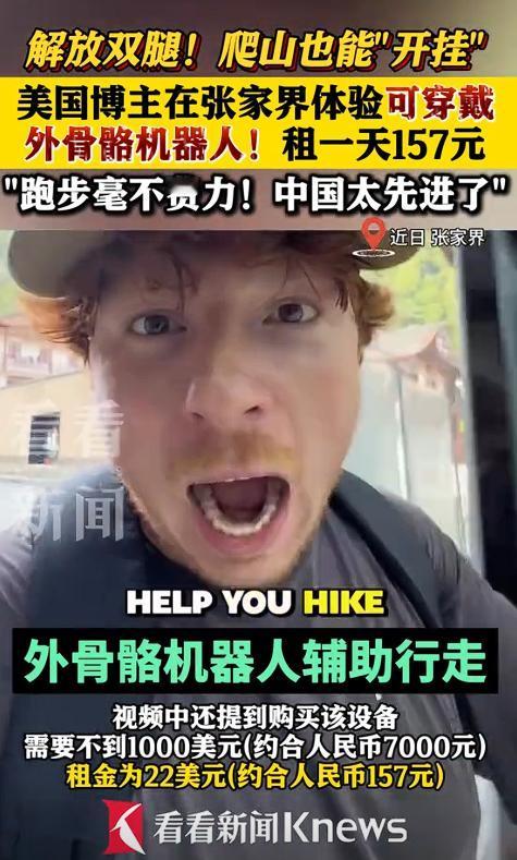 外国人在中国破防了!湖南张家界,两美国游客正准备爬山,突然看到有外骨骼机甲出租,处于好奇,半信半疑地穿上,没想到他们体验完直接傻眼,连连惊呼"中国太先进了",当听到价格时更是震撼不已! 9 月张家界国家森林公园,美国科技博主克里斯蒂安・格罗西发的一段视频,直接在海外社交平台炸了锅! 镜头里,他腰上绑着个不到 2 公斤的 “小玩意儿”,在陡得能看见台阶缝的山路上走得飞快,甚至小跑起来都不喘,嘴里还不停念叨:“这就是未来啊!中国科技居然能把爬山变成享受!” 他戴的这东西,就是张家界刚引进的 “爬山科技外挂”—— 外骨骼机器人。 别看它轻得跟件薄外套似的,能耐可不小:往腰和膝盖上一固定,能减少 42% 的膝盖弯曲幅度,相当于给腿 “装” 了个助力马达,登山时花的力气直接少一半。 更方便的是,连个手机就能操控,调模式、看还能撑多久,一眼就清楚。格罗西在视频里翻出手机界面笑:“比调手机亮度还简单!” 最让外国网友惊得直咋舌的,是这设备的 “性价比杀招”。 格罗西特意查了数据:美国同款医疗外骨骼设备,卖 5 万美元,差不多 35 万人民币,普通人想都不敢想。 可张家界这款,租一天才 157 块,买一台也才 7000 块,连美国设备的零头都不到。 “在中国,连游客都能轻松用上的科技,在美国还藏在实验室和高端医院里呢!” 他这话,直接戳中了不少海外网友的痛点。 视频传到网上,评论区立马沸腾了:“中国居然把高科技做成了‘平民价’,这才是科技该有的样子!” “原来爬山能这么轻松?下次去张家界我必试!” 还有网友对比中美科技产品感慨:“美国总说自己科技领先,可中国都把创新用到游客登山体验上了,这才叫真的‘以人为本’!” 其实,张家界这外骨骼机器人能火出圈,不只是因为 “爬山不费劲”,更因为它藏着中国科技的 “民生温度”。 不把高科技当 “奢侈品” 供着,反倒让它走进景区、贴近普通人,用 157 块的日租价,打破了 “高科技必贵” 的老印象。 就像网友说的,比起实验室里那些看不懂的参数,能让老人少歇几口气、让年轻人多赏几处风景的创新,才更有劲儿。 以后说不定会有更多 “中国科技外挂” 走进生活,但这份 “把复杂科技变简单,把高端创新变亲民” 的初心,才是最打动人的 “真本事”。 而张家界,也早不只是靠山水吸引人的地方了,更成了让世界看见中国创新的一个鲜活窗口。 对此,你有什么看法呢?