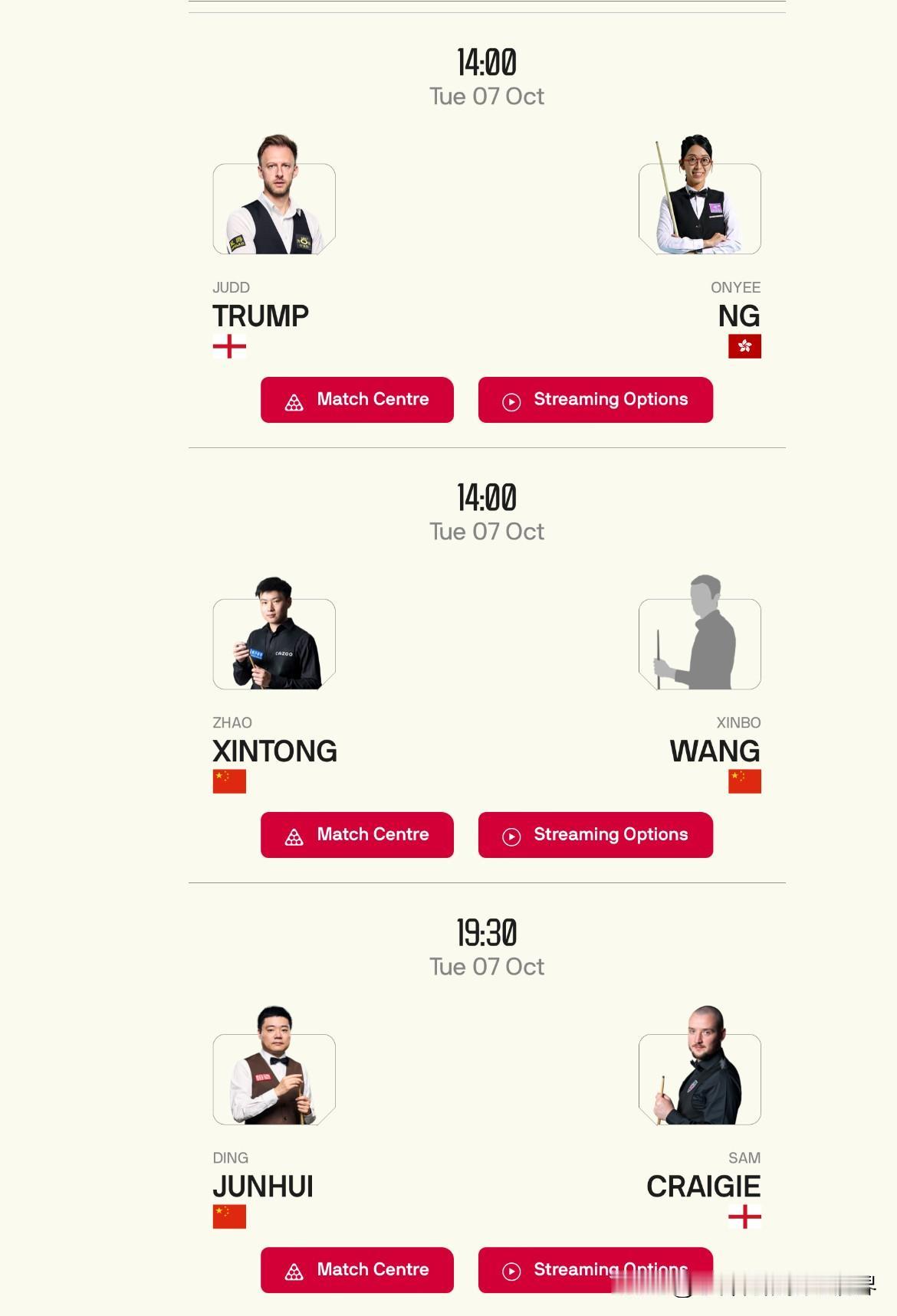 斯诺克西安大奖赛赛程安排: 延期资格赛: 英国时间 03:00,中国时间10:00 🏴凯伦·威尔逊 vs 哈里斯·塔希尔🇵🇰 第一轮: 英国时间 07:00,中国时间 14:00 🏴贾德·特鲁姆普 vs 吴安仪🇭🇰 🇦🇺尼尔·罗伯逊 vs 利昂·克劳利🇮🇪 🇨🇳赵心童 vs 王心博🇨🇳 英国时间 12:30,中国时间 19:30 🏴罗尼·奥沙利文 vs尤兰·博伊科🇺🇦 🇨🇳丁俊晖 vs 萨姆·克雷吉🏴 第二轮: 英国时间 07:00,中国时间 14:00 🇹🇭塔猜亚 vs 江俊🇨🇳 🏴斯蒂芬·马奎尔 vs 罗伯特·米尔金斯🏴 英国时间 12:30,中国时间 19:30 🇹🇭诺鹏·桑坎姆 vs 米哈尔·苏巴奇克🇵🇱 西安大奖赛第一天有4位中国球手登场,香港女将吴安仪率先挑战世界第一特鲁姆普,赵心童和王心博上演德比,丁俊晖和奥沙利文于晚上黄金时段亮相。斯诺克