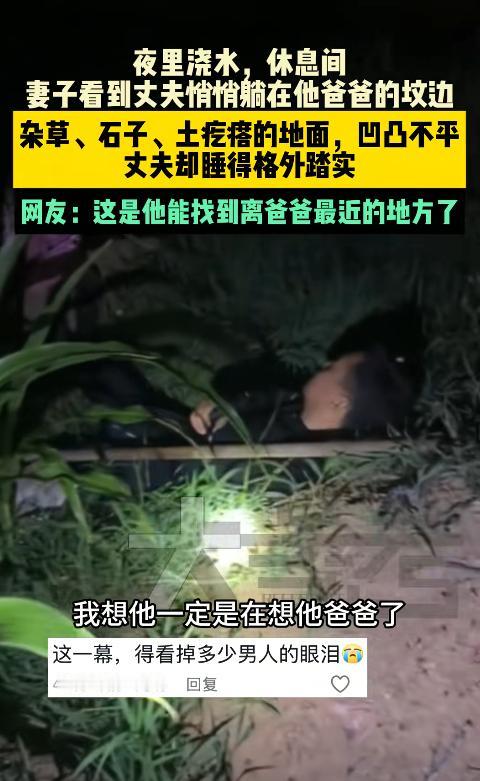 这一幕,看得人心头泛酸!7月31日,河北,妻子夜里起来给地里浇水,却看到丈夫躺在公公的坟边睡觉!妻子:“这是离他父亲最近的地方了,他肯定想爸爸了!”网友:人有生老三千疾,唯有思念不可医! 刘女士和丈夫结婚后,生活一直幸福丈夫性格稳重体贴,对家庭照顾得无微不至,家里虽不富裕,但总是笑声不断。 刘女士与公公、婆婆的关系也很好,公公为人和善,闲时喜欢在院子里修花养鸟,常笑着夸她“贤惠、懂事”,一家几口常常围坐在一起吃饭、聊天,平凡的日子里透着踏实的幸福。 可这一切在公公去世的那一年,悄然改变了。 那年冬天,公公突感身体不适,被送进了医院。刘女士和丈夫几乎天天往返病房,夜里守在病床边,盼着老人能挺过去。 公公虽病重,却仍惦记着家里的每一个人,总是让他们别太辛苦,嘴里还念叨着:“等我好了,咱们去吃顿饺子。” 可惜奇迹终究没有出现,没过多久,公公离开了人世,那天,刘女士看着婆婆无声地哭倒在地,丈夫眼里也噙着泪,却硬是强忍着,替父亲操办后事,整个家都陷入了一种难以言说的寂静。 自那以后,刘女士明显感觉丈夫变得沉默了许多,夜里,他常坐在窗边发呆,不说话。 那天夜里,刘女士轻手轻脚地起床,想给家里地里的蔬菜浇水,顺便散散心,她提着水壶,沿着泥泞的小路走向田地。 走到田里时,她的目光被一处熟悉的身影吸引,那是她丈夫,安静地躺在自家父亲坟前,坟地的土地坑坑洼洼,他蜷着身子,似乎只是想靠近父亲,哪怕只是静静地守着,也能得到一丝安慰。 刘女士站在远处,看着丈夫在冷风中沉沉睡去,心头一阵酸楚,眼泪不由自主地顺着脸颊滑落,她轻轻放下水壶,蹲下身子,怕惊扰他,伸手想握住他的手,却又迟疑着,只能静静守在一旁。 刘女士低声自语:“你累了吧,也想见父亲……” 刘女士知道,自从丈夫的父亲走后,这个男人就再也没睡过一个好觉,夜夜失眠,为了不吵到妻子,他干脆搬到了别的屋子自己睡,在外人眼里,他是能撑起一片天的大男人,是家里的顶梁柱。 可谁又知道,这个顶梁柱也曾是被父亲护在身后的孩子,那句“最爱他的那个人不在了”,说的不就是他吗?当最大的依靠轰然倒塌,内心的秩序早已乱成一团。 或许,只有回到离父亲最近的这个地方,身体紧贴着这片土地,他才能重新找到那种被守护的感觉。 这片粗糙、冰冷的土地,反而成了治愈他内心失序的唯一良方,一个能让他暂时卸下所有防备的精神锚点。 有网友看到这个视频后说道:人人都怕鬼,唯有自己最亲近的人离去,从内心里都不会再怕,因为那里躺着最爱我们的人…… 信息来源:大参考