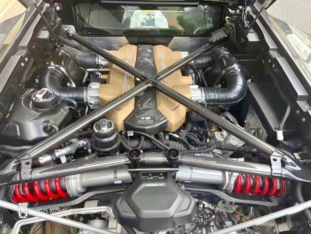 这台车配备了个Sian一样的动力系统,V12发动机➕超级电容混动,峰值功率814匹,极速355km/h,百公里加速2.8s。