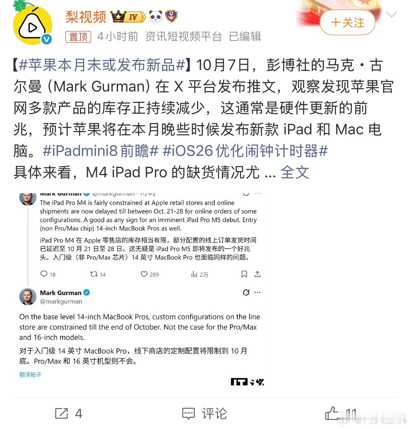 苹果本月末或发布新品苹果10月份新品里面大家最关心的应该就是M5的iPad Pro,目前来看M5比M4性能提升微乎其微,主要是AI性能的提升,所以老用户没必要纠结换,因为日常你刷视频、打游戏其实并不会有什么明显提升,反而我挺推荐普通用户在M5发布之后去买M4,还能便宜不少。