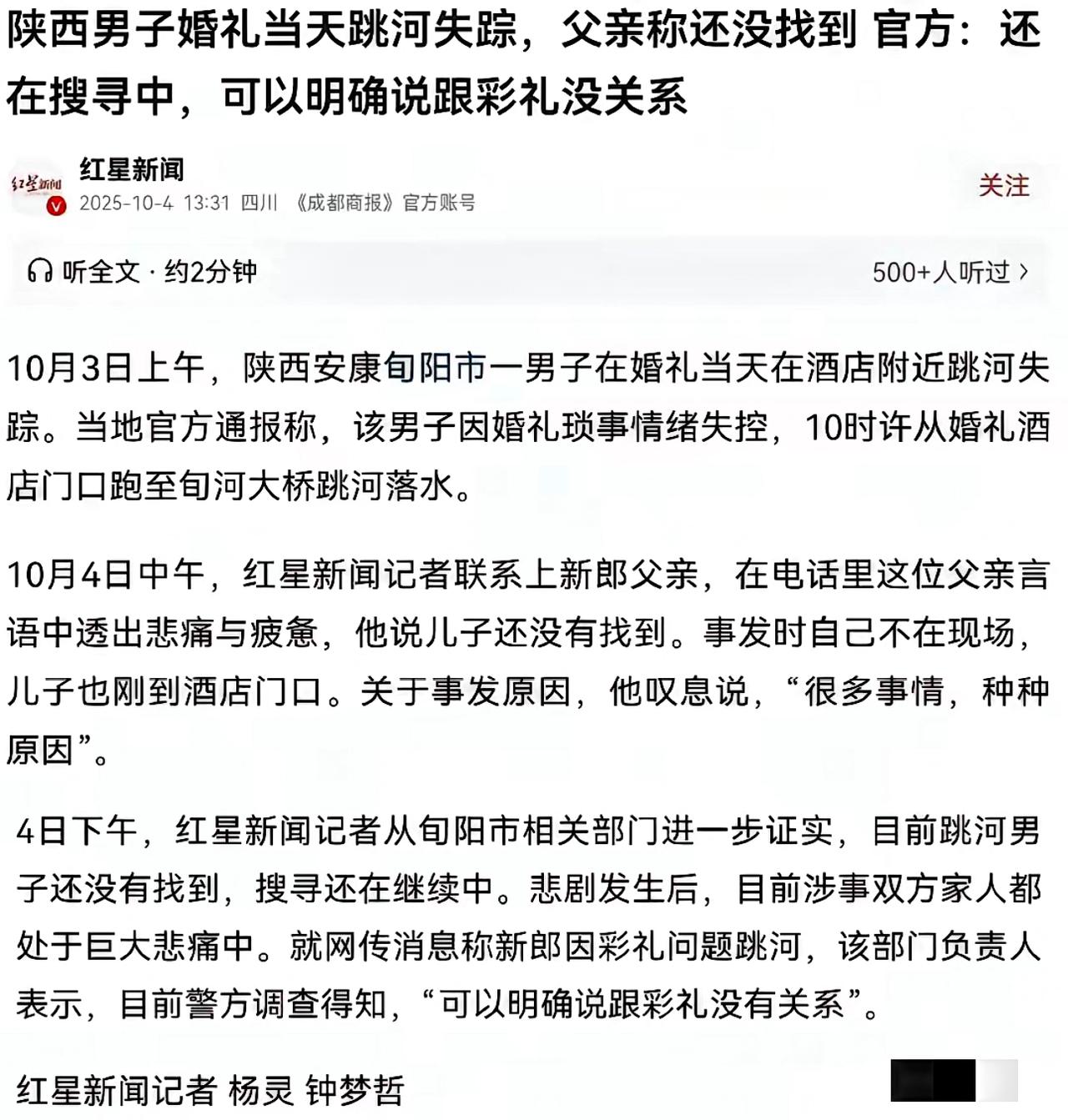 别再揪着彩礼猜了!陕西新郎跳河的真相,早藏在他的朋友圈里。 订婚前的他多鲜活啊,朋友圈九条动态七条是未婚妻,玫瑰对戒配着“余生请多指教”,满屏都是藏不住的甜。可2023年一订婚,这人像突然“熄火”了,两年就更了三条动态:感冒自拍、凌晨两点的电脑屏,最后婚礼请帖只写“来了就好”,发的时候愣了十秒像耗光了力气。 哪是什么突然崩溃?分明是被房贷、生活压力慢慢磨没了精气神。官方早说了和彩礼无关,压垮他的从来不是某件事,而是那些说不出口的疲惫一点点攒成了山。 一个脾气温顺的研究生老师,把七年爱恋熬成沉默,真的太让人唏嘘。搜救还在继续,但这件事早该敲醒我们:成年人的崩溃从不是突然的,你身边有人正在默默扛着吗?