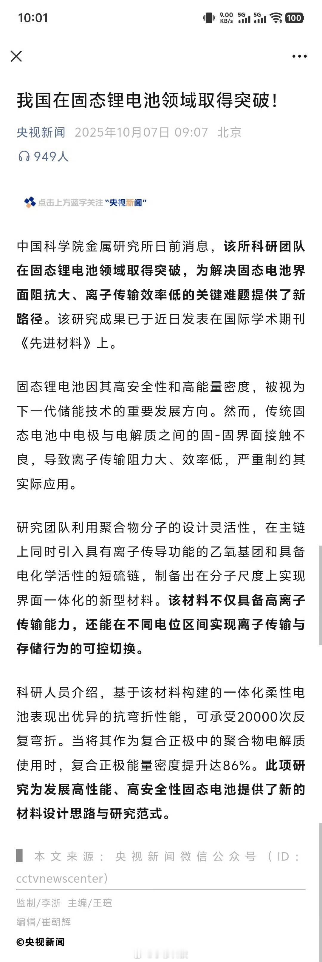 固态电池技术有突破了,希望早点能落地,对新能源和手机都有非常大的推动,不仅是续航,更是安全性的大跃进[鼓掌]