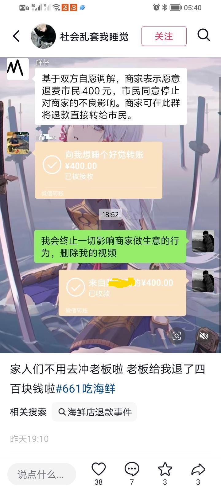 10月7日,极目新闻记者联系当事游客杨先生和餐厅方,均未得到此事的进一步回应。记者注意到,杨先生已删除此前投诉此事的视频,并于6日晚发布了一张微信群截图,显示双方疑似已达成调解,一个微信名叫陈某的人向他退费400元。
