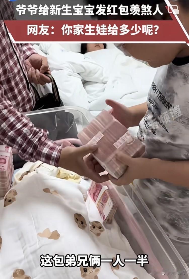 眼红了,真不愧是江苏! 江苏一位爷爷拎着个大黑包去医院看望刚出生的小孙子。嘴里念叨着:“爷爷今天来给你发红包了,先来个小的。” 说完,就从包里拿出了一沓钱,你没看错,就是一沓!放完一沓又一沓。 接下来更是重量级级别的。直接拿出了一大捆钱,就这样水灵灵地放在小孙子的身旁。 一捆估计有10万。 给完小孙子,又拿出一大捆给大孙子:“都有啊,弟兄俩一人一半!”爷爷将爱平等且满含期待地分给了两个孩子。 这沉甸甸的钱不仅是物质,更是爷爷省吃俭用的心意。 大家也要理性看待,不要太关注数额,无论数额大小,沉甸甸的爱是如出一辙的。 大家有什么看法,欢迎评论!