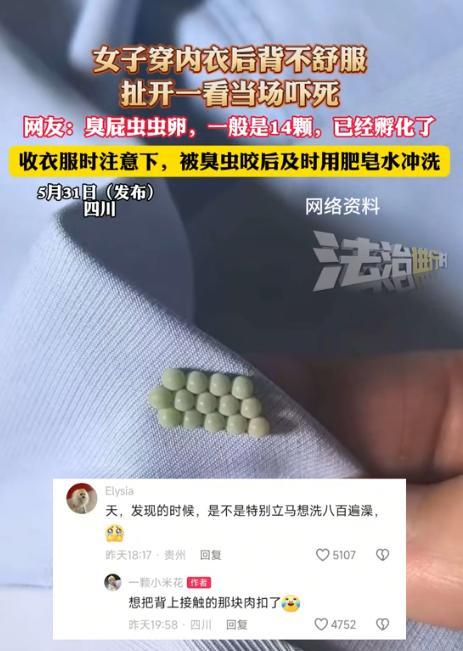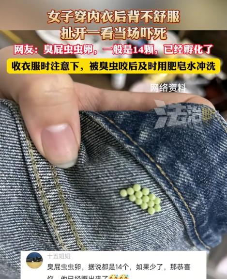 “太恶心了!”6月1日报道,四川,一女子起床穿内衣,结果,却总感觉扣不舒服,她将内衣一把扯开,竟然在上面发现了14个球状物体。 四川成都的张女士(化名)碰上了一件让她想想都头皮发麻的事。 那天早上,她准备出门上班,像往常一样从阳台上取下晾干的内衣穿上。 刚扣好扣子,后背就开始发痒,还隐隐觉得有东西硌着。 她伸手去挪了挪扣子,以为是肩带扭了或者洗衣机搅得变形,结果怎么调都不对劲,越动越扎人。 “当时总感觉有一粒一粒的东西顶着皮肤,硬硬的、滑滑的。”张女士心里发毛,直觉不太对。 她赶紧跑进卫生间,对着镜子摸了几下,还是找不出问题。 最后一咬牙,干脆扯开内衣一看,当场吓得往后一退,差点把内衣扔掉。 内衣后背那层布上,密密麻麻粘着一排淡绿色的小圆球,一共有十四颗,整整齐齐排成一条线,像有人特意摆好的。 那些小球圆润透亮,在灯光下还反着点微光,看着像小珍珠,又有点像塑料珠子。 可越看越不对劲。 “我当时汗毛都立起来了,觉得太诡异了。”张女士说,她赶紧把内衣放在洗手台上,掏出手机拍照发到网上问网友,“谁见过这种东西啊?” 没多久,评论区炸锅了。 有人立刻认出来说:“这不是珠子,这是臭屁虫的卵!一窝刚好十几颗一排,和你这图一模一样。” 看到“虫卵”两个字,张女士胃里一阵翻腾,浑身发麻。 她赶紧把内衣扔进水池,用开水冲,又拿毛巾死命搓后背,直说“浑身都痒,恶心得不行”。 后来她查资料才知道,这种“臭屁虫”学名叫椿象,是春夏常见的害虫。 每年四五月份是它们的产卵季,喜欢在柔软又有纤维感的地方下卵,比如衣物、窗帘、蚊帐,甚至是晾在阳台上的内衣。 昆虫专家解释说,椿象一般不会主动进屋,多半是飞进阳台时体力不支或者误认环境,把晾晒的衣物当成“产房”。 每次产卵量十几颗不等,常常排得整整齐齐,看起来还挺“工整”。 网友里有人提醒她:“你得数数看,有没有少一颗,少了说明已经孵化出来了!” 张女士当时心跳都快飙上去,对着灯一颗颗数了三遍,确定十四颗都在,这才松了口气。 她不敢用手碰,拿镊子小心地一个个夹下来扔进下水道,又用滚烫的开水泡内衣,还拿去太阳底下暴晒一下午。 事后她再也不敢大意。 现在每次收衣服,她都要翻个遍,尤其是内衣、床单、枕套这些贴身物件,里里外外都要检查。 张女士说:“以前晾衣服随手一抖就收,现在不敢了。哪怕多费点事,也比被虫卵吓一跳强多了。” 这件事传到网上后,很多人也开始警惕起来。 有人说自己也在T恤、窗帘上见过类似的卵,以为是植物种子。 还有人打趣:“这虫子还挺讲究,排卵排得比我摆积木还整齐。” 专家提醒,椿象卵本身不会直接危害人体,但一定别用手拍或捏,因为成虫受刺激时会喷出臭液,能让皮肤红肿刺痛。 清理时最好戴手套,用镊子或小刷子轻轻弄掉,再洗净晾干。 张女士后来跟朋友们打趣说:“真是被这十四颗小球上了一课。以后晾衣服,不光要晾干,还得查干净。要不哪天穿个‘虫卵牌’内衣出门,那可真是想哭都来不及。” 对此你怎么看? 信源:法治进行时