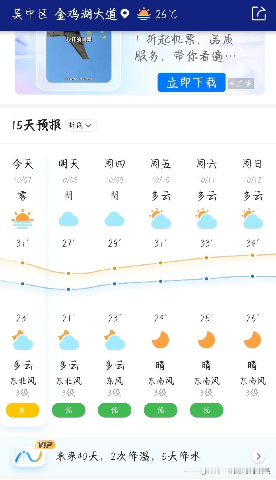 苏州人注意,明天早上8点41分就寒露了!但这天气哪有“寒”的影子? 看天气预报,接下来一周最高温都奔着30度去,12号甚至要到34度,空调还得接着开。老话说“寒露脚不露”,现在光脚穿凉鞋都不觉得凉,短袖更是脱不下来,刚收进柜子的薄外套纯属白折腾。 有人说这是“下午寒露热死牛”,今年寒露虽在上午,但秋老虎就是赖着不走。不过昼夜温差还在,早上出门最好揣件薄衣,别中午热得冒汗,早晚又着凉。 这反常天气,螃蟹倒吃得挺香,就是这“暖寒露”实在让人摸不着头脑!苏州秋老虎 苏州气候 苏州天气预报 明天8时41分苏州正式进入寒露 明天寒露 寒露 图一由sAI生成 图二截图于手机