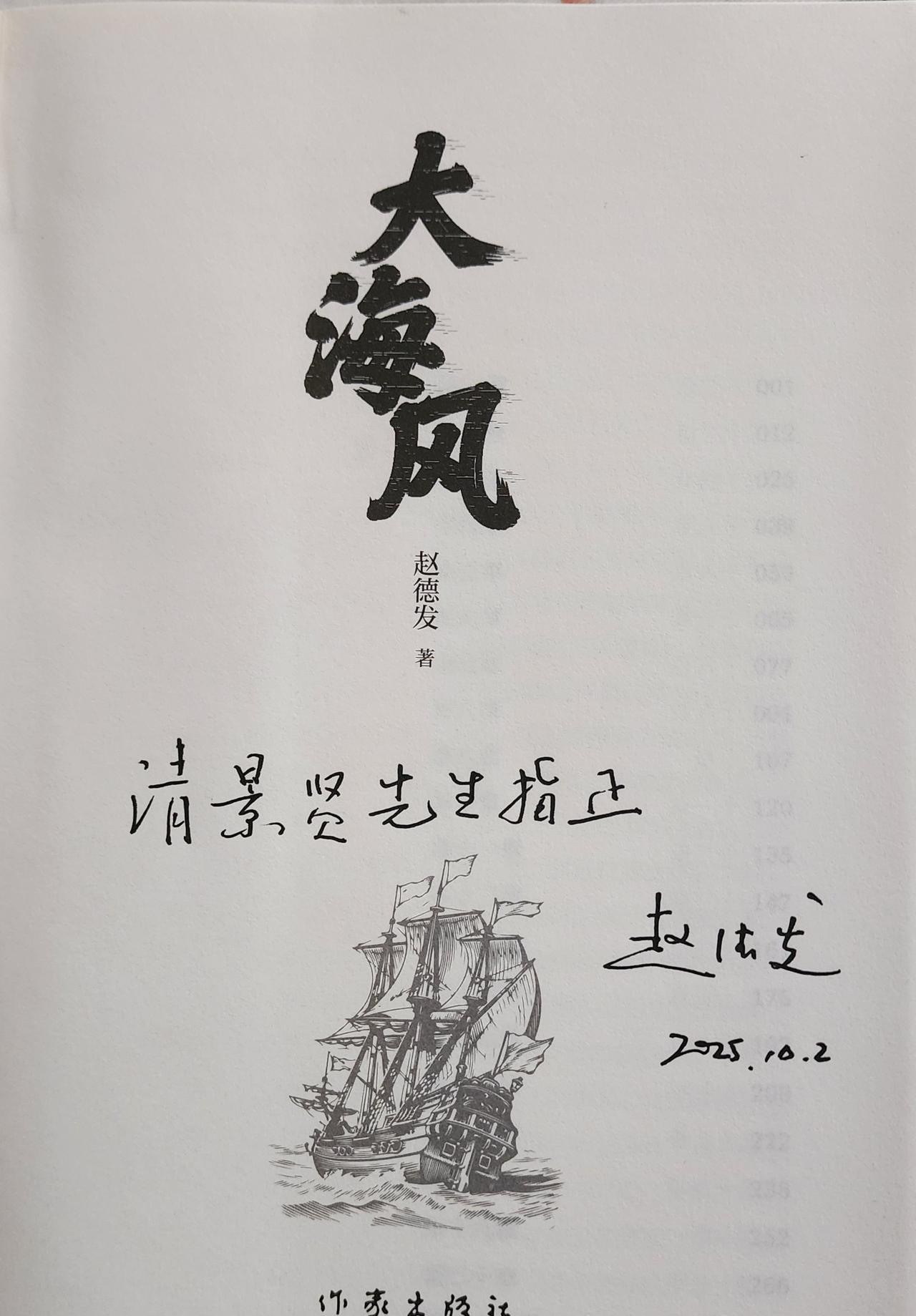 今天收到山东省作协副主席、著名作家赵德发寄来的新作《大海风》,作品由作家出版社出版,精装本,55万字。装帧精美,典雅大气,甚爱之。赵德发先生因是电视连续剧《生万物》的原创者,近来受到热切关注。《大海风》属于海洋文学,之前他的《经山海》是他首次涉足海洋文学,并由央视拍成了电视连续剧,获得好评。《大海风》是他的又一部海洋题材的新作。有评论家评论说,《大海风》可与陈忠实的《白鹿原》相媲美。我国文学涉及海洋题材的比较少。赵德发在海洋题材的文学创作中下足了功夫,出手不凡,《经山海》《大海风》就是他创作的成果,在文坛产生强烈的反响,为海洋文学创作作出了贡献。