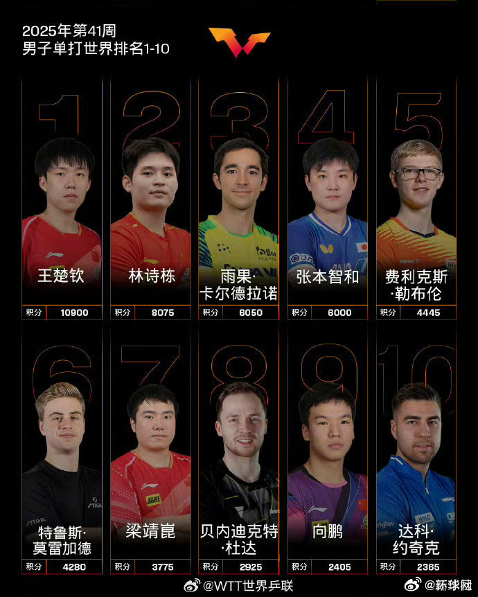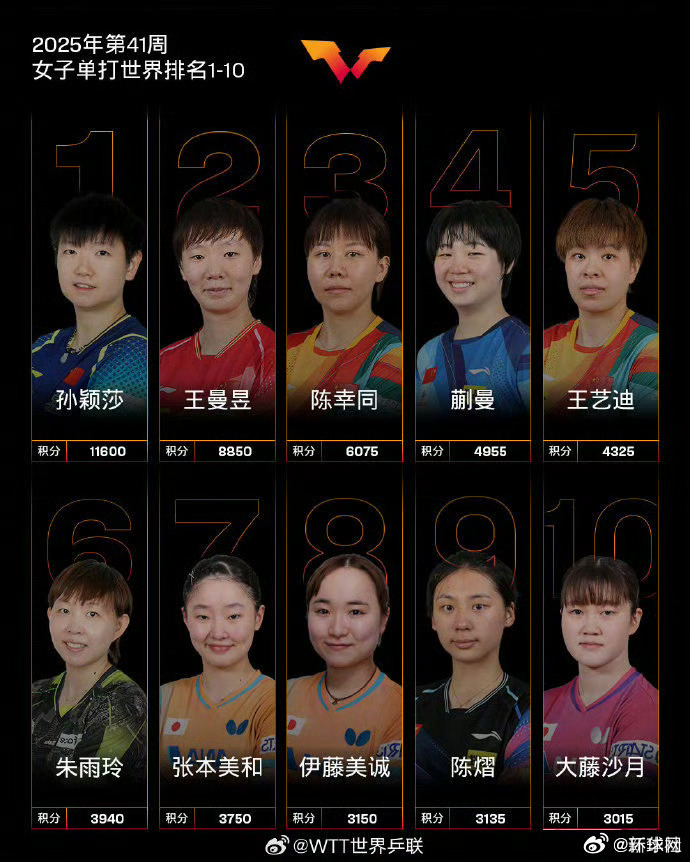 #孙颖莎11600分世排第1#【#国际乒联最新排名公布#】10月7日,国际乒联公布2025年第41周排名。女单方面,11600分世界第一,、、蒯曼、王艺迪位列第二至第五,陈熠位列第九。男单方面,10900分排名第一,位列第二,位列第七,向鹏位列第九。(WTT世界乒联)