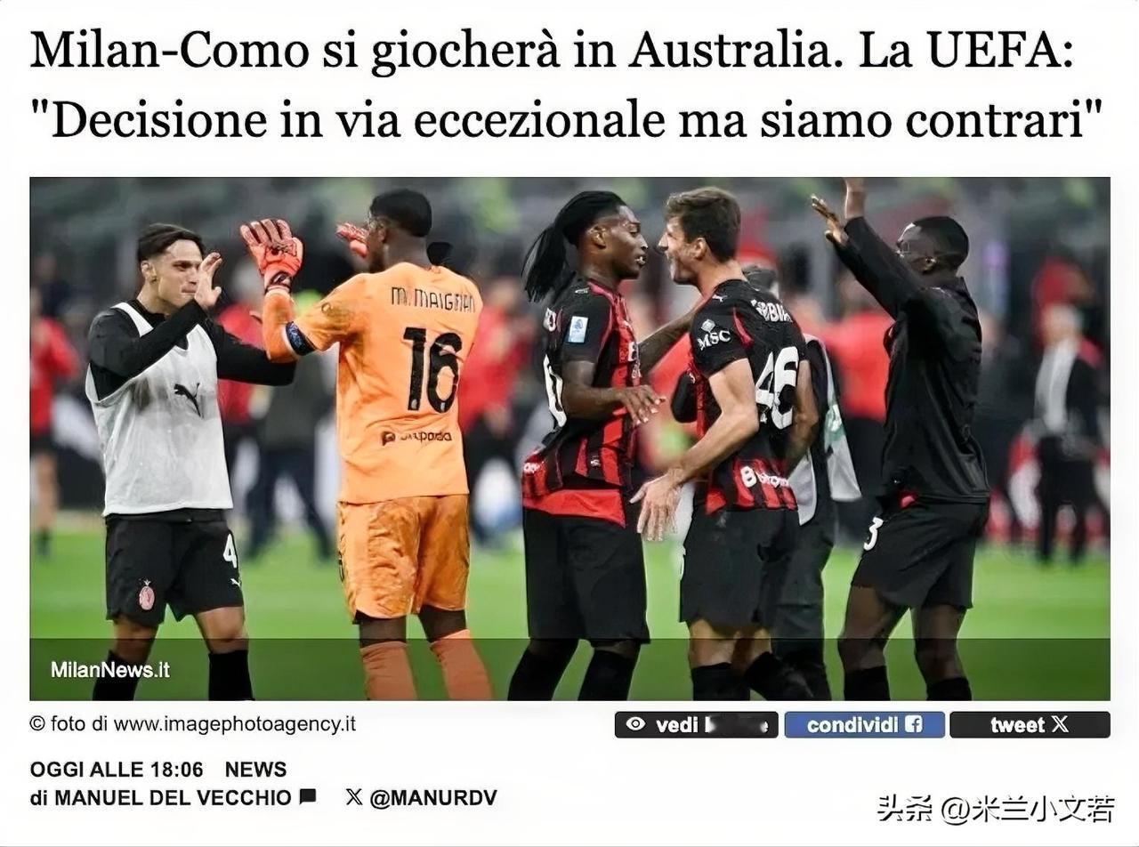 米兰海外联赛被欧足联否决!根据欧足联执行委员会今天做出的决定,由于圣西罗球场将用于冬奥会,米兰对科莫的比赛将在2026年2月7日或8日在澳大利亚举行;比赛地点为珀斯的奥普特斯体育场,这一海外联赛设想被欧足联否决。 这个事情我没理解,意大利联赛确实欧足联有管理权,但米兰与科莫这个事情不应该是意大利足协来管理吗?无论怎么说这都是本国联赛,联赛的事情肯定是本国联赛管理者,这个事情和欧足联有啥关系,就算有关系也是意大利足协和欧足联的关系,更重要的是比赛地点是在亚洲,澳大利亚属于亚洲,就算否决也是亚足联否决,亚足联说我们不欢迎这样的海外联赛尝试。 这个事情红鸟集团还是很有想法的,澳大利亚被称为土澳不是没有原因的,米兰去那边无论是对球队影响力还是其他潜在受益肯定是有益的,估计欧足联否决是担忧这样的模式一旦形成,未来各个联赛都会出现这种海外联赛模式,管理上可能会带来麻烦。
