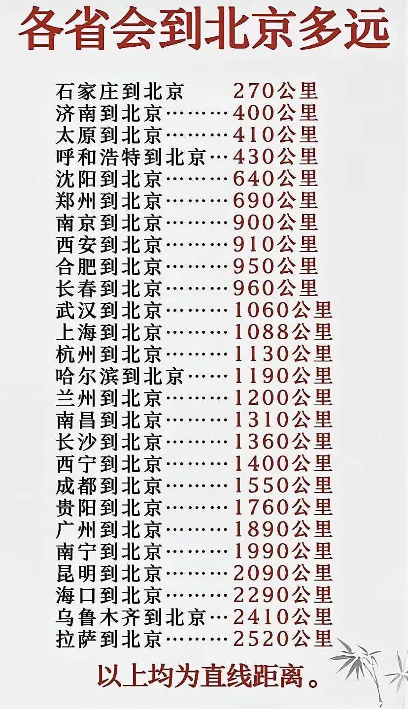 各省会到北京的直线距离差异还挺大。离北京最近的是天津,仅134KM,开车一个多小时就能到。像石家庄到北京291KM,也不算远。 但有些省会离北京就远了。比如乌鲁木齐到北京直线距离达2781KM,坐飞机都得五六个小时;拉萨到北京更是有3553KM,坐火车得两天两夜。广州到北京也有2120KM。 这些距离不仅是地理上的数字,也反映出各地不同的风土人情和发展差异。这么看来,祖国真是幅员辽阔啊!