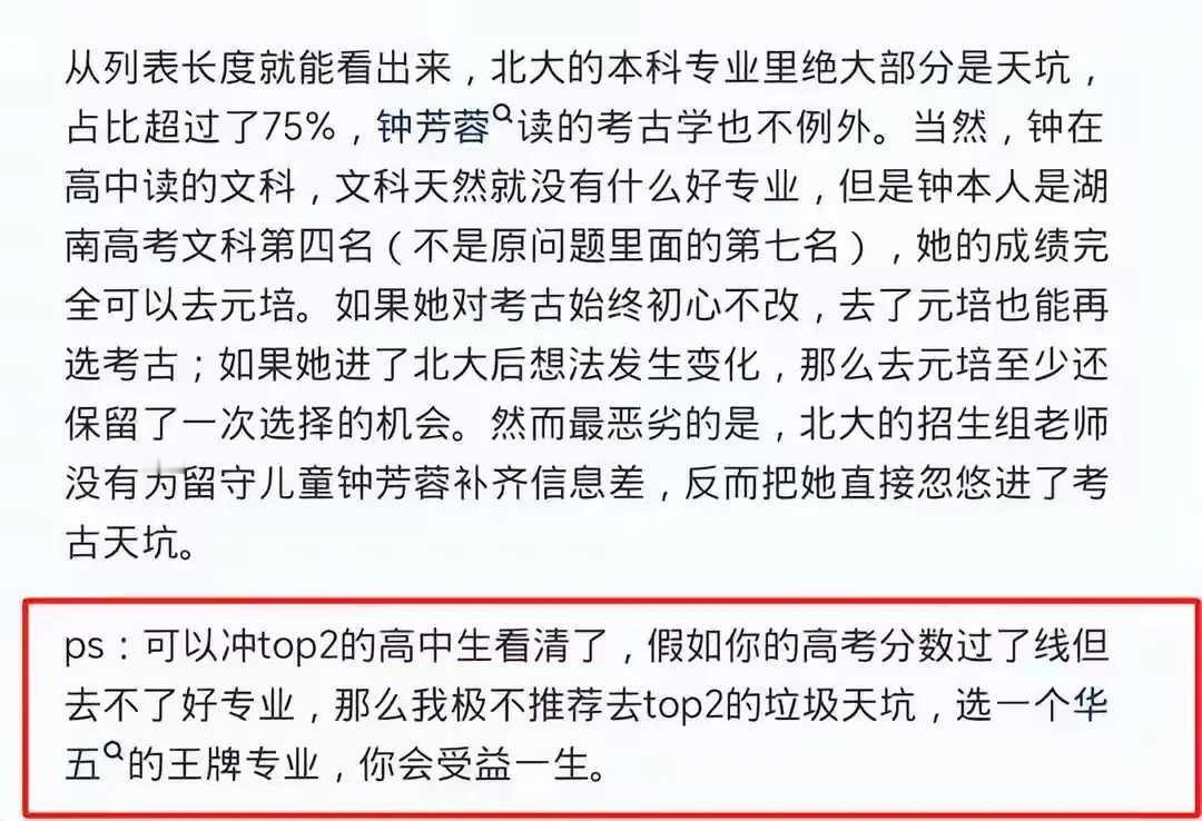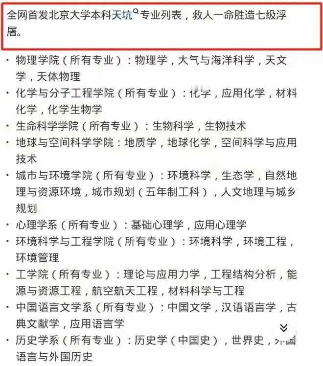现在高考志愿填报,专业选择成了家长们的热议话题。有中年家长直言“北大专业75%都是天坑”,还列了清单,这可惹了其他家长。大家看法不一,有人觉得名校毕业学啥都有出路,有人则很现实,按就业和薪资选专业。 那位家长把北大从物理、化学到生物、社会学等众多专业都归为“天坑”,标准就是就业和工资。其实“天坑”概念这几年也在变,像生物科学类就业率涨了,可岗位多是实验员;环境工程借“双碳”东风,但岗位稳定性和政策有关;心理学靠带货起薪变高。高考选专业,还真得结合现实多考量。