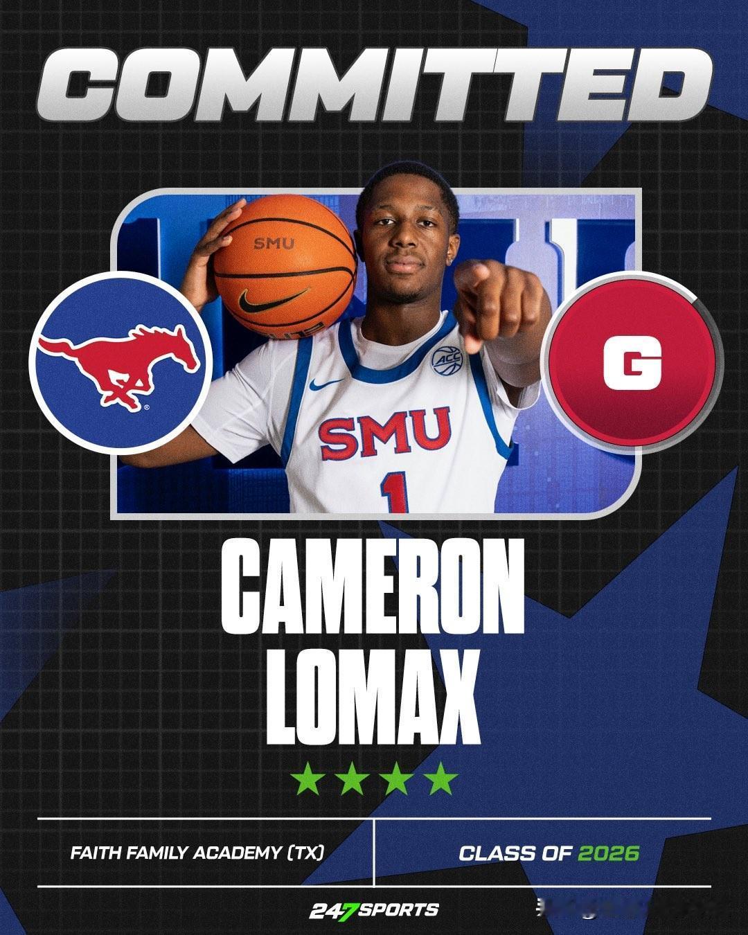 四星控卫Cameron Lomax宣布承诺NCAA男篮 SMU,高四赛季转学至德州Faith Family Academy,球队将参加2025-26赛季耐克EYBL Scholastic联盟,身高6-1=185,选择这里是因为我和家人感受到了浓厚的家庭氛围,教练组相信我有潜力成为一位更好的球员,在场外也能成为一个更优秀的人。