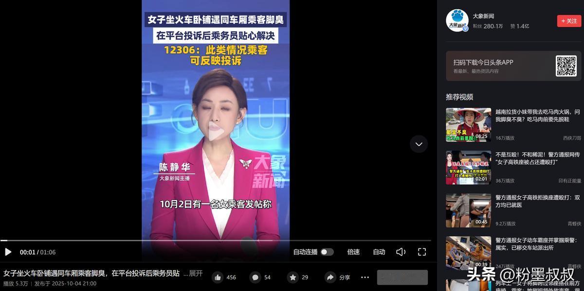 “太尴尬了!”10月2日,一女子乘坐火车从齐齐哈尔去南京,结果刚一上车她就傻眼了,同车厢的一位大哥脚臭的她根本没法忍,她直接在软件上投诉,没过一会就来了一位男乘务员来解决,网友:原来乘务员还能这么服务! 10 月 2 日那天,我拎着行李箱在齐齐哈尔站上车,要去南京,整整 30 多个小时的硬卧,我提前备了薯片、泡面,还下载了几部剧,想着路上能舒舒服服打发时间,结果刚找到自己的铺位放好行李坐下,我就傻眼了,旁边下铺的大哥刚脱了鞋,那股味儿一下就飘过来了。 说真的太尴尬了!我鼻子下意识就皱起来,手里刚拆开的薯片包装袋都停在半空,瞬间没了胃口,车厢里空间小,硬卧的铺位挨得近,那味儿闷闷的散不开,我坐也不是站也不是,想挪到过道去,又怕大哥看出来我是嫌弃他多伤人啊。 我偷偷瞄了眼大哥,他身边放着个发皱的工地安全帽,脚边是个磨破边的帆布包,看着像是刚从工地上下来,估计是赶长途车累坏了脱鞋是想放松点。 我坐立难安了快半小时,连盒饭都没敢买,一想到吃饭时要闻着那味儿我就反胃,可又实在没法忍,总不能这一路都憋着吧?跟大哥当面说?我在心里演练了好几遍,“大哥能不能把脚盖一下?” 这话到了嘴边又咽回去了,万一他觉得没面子吵起来多不好看,公共场合闹僵了大家都尴尬。 后来我实在没辙掏出手机点开 12306,想着试试投诉能不能解决,我犹豫着填了车厢号,简单写了句 “同车厢乘客脚味较大,影响乘车体验”,提交的时候还挺忐忑,怕处理得太生硬,让大哥下不来台。 没想到没过十分钟,就有个穿制服的男乘务员过来了,他没大声嚷嚷,而是走到大哥身边,稍微压低了声音,笑着说:“大哥您这一路辛苦啦,车厢里人多,您要是不介意,用被子盖下脚,再把鞋子挪到窗边通风的地方,这样大家都舒服点,您看行不?” 大哥愣了一下赶紧点头,还不好意思地笑了笑,立马扯过被子盖住脚把鞋子拎到了窗边。 乘务员处理完大哥那边,又转身走到我跟前,从口袋里掏出一个崭新的口罩递给我:“女士给您个口罩,要是还觉得不舒服,咱们这边下铺刚好有个空位,我帮您协调下,您看要不要换过去?” 我接过口罩心里又意外又暖,本来只是想解决气味问题,没想到乘务员还这么贴心,连换铺都考虑到了,我连忙说不用换铺,有口罩就够了这时候才觉得,原来乘务员还能这么服务啊,不是硬邦邦地批评,而是两边都照顾到了。 那天晚上我睡得还算安稳,口罩戴着没怎么闻到味儿,偶尔醒过来还看到大哥悄悄用湿纸巾擦脚,擦了好几回,估计也是怕影响别人。 第二天早上我醒得早,刚坐起来就看到枕边放着一张纸条,上面写着 “不好意思,影响你休息了”,旁边还放着一个没开封的红苹果。 我拿着纸条和苹果,心里一下就软了,之前那点尴尬早就没了,反而有点不好意思,其实大哥也不是故意的他也在尽量注意。 后来我把这事发到了网上,好多网友评论说 “这乘务员处理得太到位了”“原来遇到这种事还能这么解决”,还有人说之前不知道 12306 能投诉,现在才知道座椅上有 “畅行码”,打 12306 热线也能反映问题,我这才发现原来我随手的一次投诉,还成了大家了解铁路服务的小例子。 (信息来源:大象新闻)
