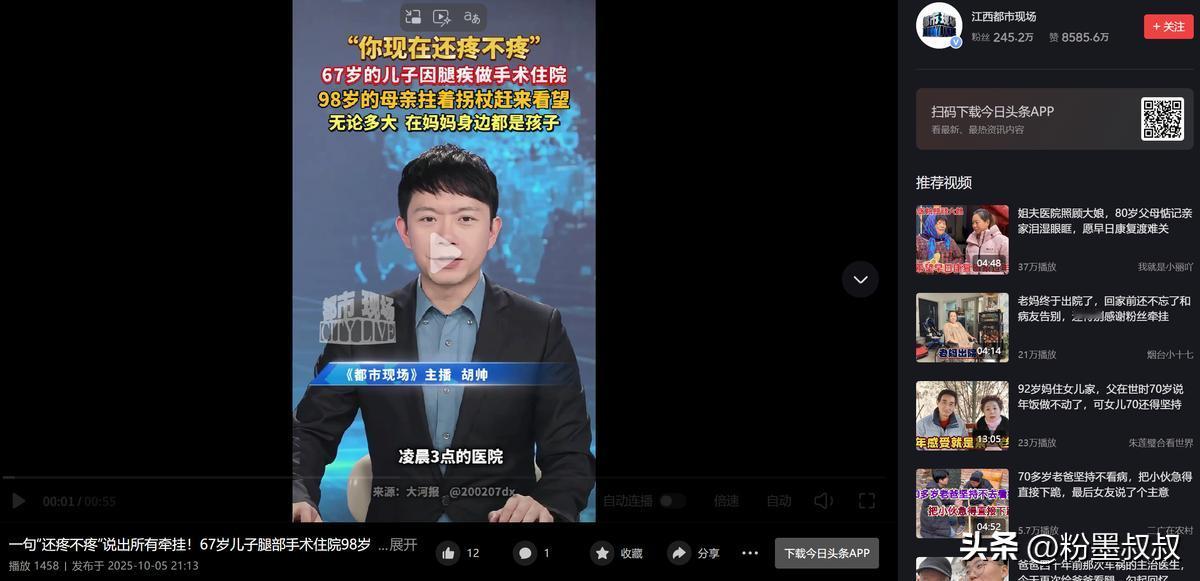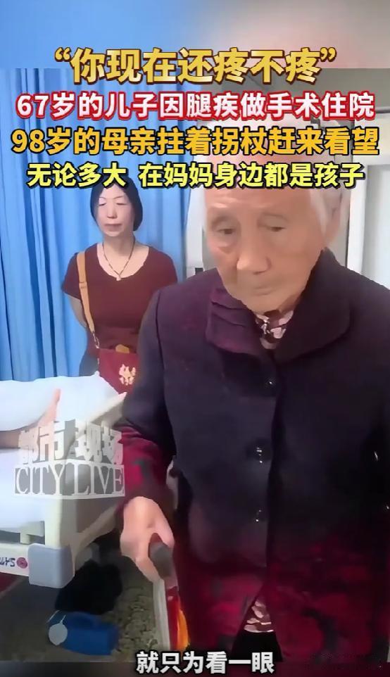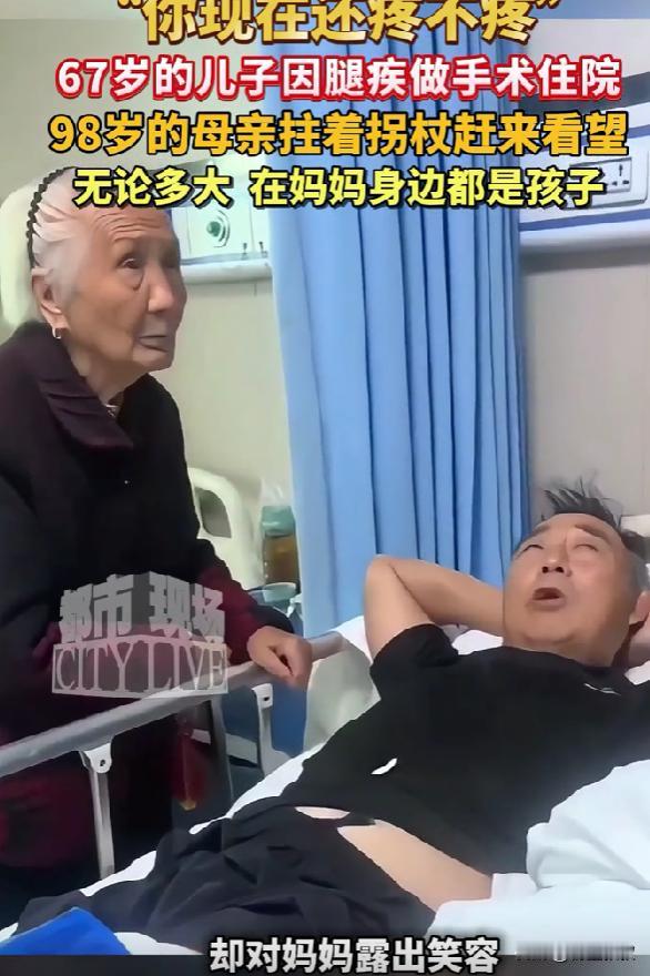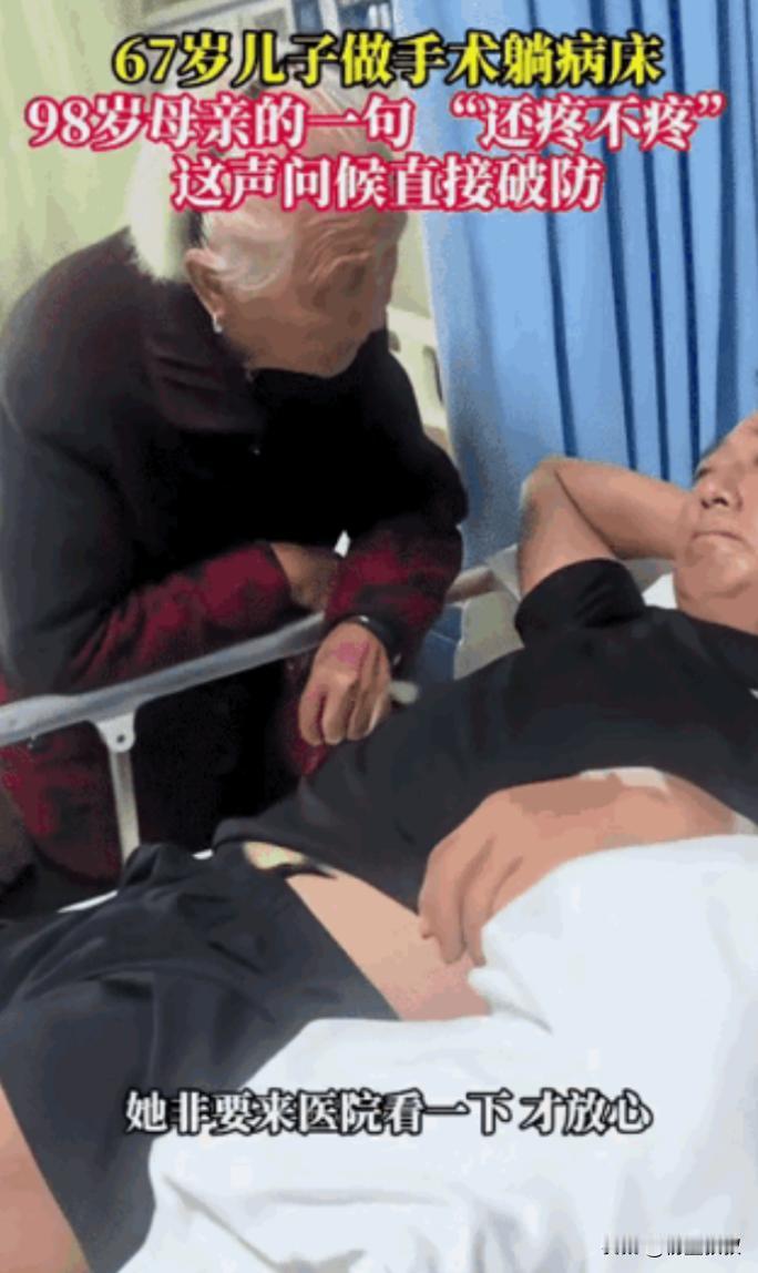 破防了!河南,67岁男子做手术躺病床上。突然,98岁母亲来看望,问他: “还疼不疼。”他说: “不疼。”网友: 不管多大岁数,有母亲的牵挂,就是幸福的 李大哥做手术前,跟家里人千叮万嘱,千万别告诉老妈,他总觉得妈都快百岁了,耳朵有点背,腿脚也不利索,平时出门都得拄拐杖,要是知道自己住院开刀,肯定会坐立难安,夜里都睡不好。 家里人也懂他的心思,每次老太太打电话问 “儿子咋好几天没来看我了”,都找借口说 “他忙着家里的事,过两天就来”,就这么把事儿瞒了下来。 可老太太心里跟明镜似的,儿子平时隔三差五就会拎着水果来看她,哪怕就坐十几分钟,陪她说说话也会来,这次连着好几天没见人,打电话也总说在忙,她就觉得不对劲。 有天早上老太太自己拄着拐杖,慢慢悠悠走到儿子家,门是锁着的敲了半天也没人应,她没走就在门口坐着等,直到邻居路过跟她说 “你儿子住院做手术了,怕你担心没说”,老太太一听,当下就急了非要去医院,家里人拦都拦不住,最后只能陪着她往医院赶。 到了病房门口老太太没立刻进去,扶着门框停了好一会儿,我猜她是在给自己打气,也怕看到儿子虚弱的样子心里受不了,她慢慢挪到病床边,眼神一直落在李大哥的伤口上,那只布满皱纹、有点发抖的手,伸出去想碰又不敢碰生怕弄疼儿子,最后就那么僵在半空。 然后才用带着颤音的声音问 “还疼不疼”,声音不大,却满是心疼,病床上的李大哥,本来还想强装没事,可一抬头看到老妈满头的白发,还有因为赶路微微发红的脸颊,一下子就绷不住了,眼眶通红哽咽着说 “不疼”。 其实谁都知道,刚做完手术哪能不疼,可在妈面前,再大的人也想让她放心,不想让她多操心。老太太听了没再多问,就坐在床边的小凳子上,拉着儿子的手,一会儿摸摸他的手背,一会儿又帮他掖掖被角,没说多少话可那眼神里的牵挂,谁都看得出来。 后来这事儿被李大哥的孙女拍下来发到网上,好多人都跟我一样破防了,有网友说 “我都五十多了,每次生病我妈还会像小时候一样守着我,不管多大在妈眼里都是孩子”,还有人说 “这种牵挂太珍贵了,有妈在,就总还有个能撒娇、能依靠的人”。 我看着评论,想起自己每次生病瞒着爸妈,最后被发现时他们又急又气的样子才明白,我们总以为 “报喜不报忧” 是对他们好,却忘了他们也想参与我们的难处,也想为我们分担点什么,那种 “被需要” 的感觉,对他们来说也很重要。 没有什么轰轰烈烈的情节,却比任何故事都让人感动,因为它太真实了,就像发生在我们身边的事,那种跨越年龄的母子情,不管多大岁数,妈妈的一句 “还疼不疼”,就是最温暖的安慰,有这样的牵挂在,再难的日子也觉得有底气。 (信息来源:江西都市现场)
