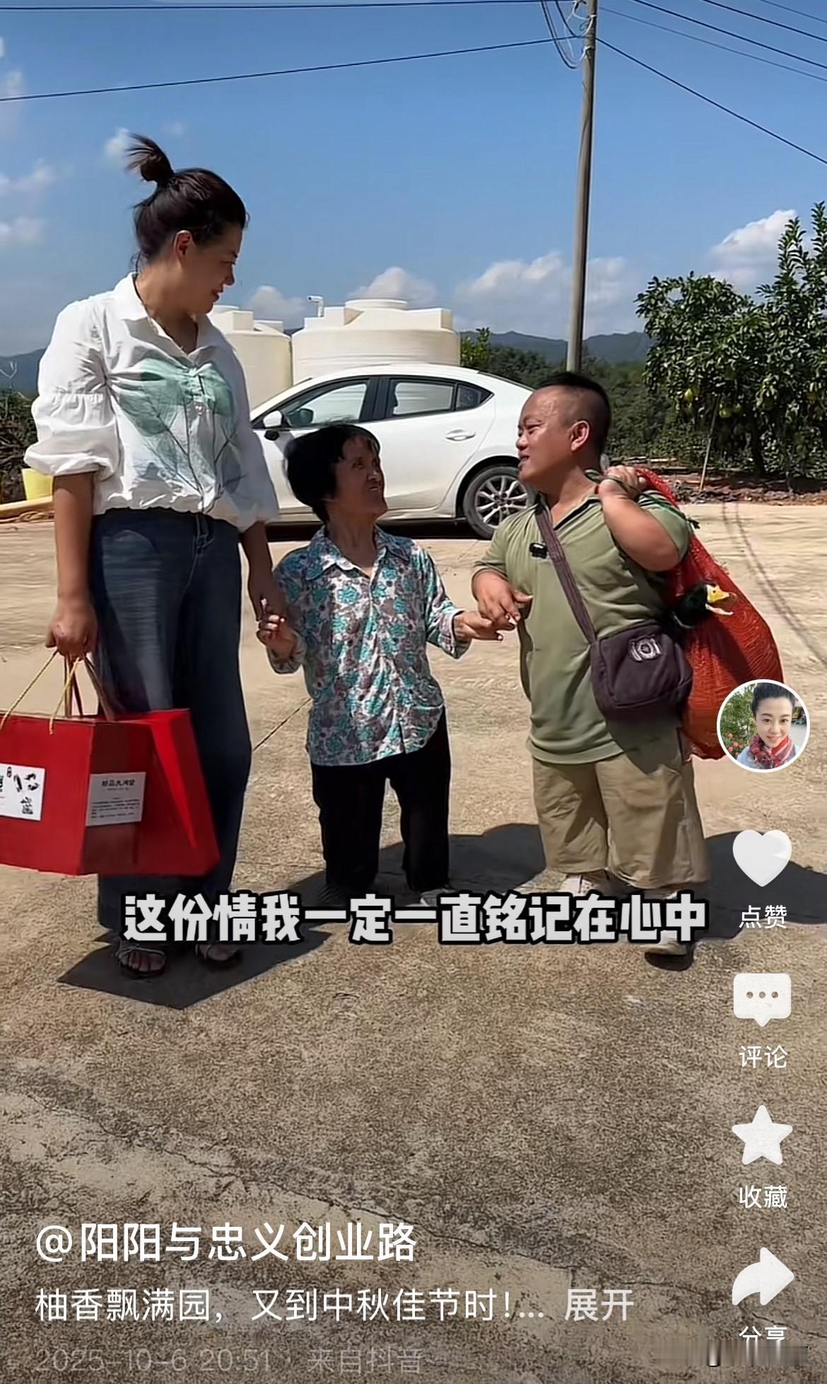 阳阳和忠义国庆假期,带着母亲两次去感恩米哥米嫂! 日久见人心,阳阳忠义经过标哥事件后,终于明白米哥米嫂才是真心,不求回报帮助他们的人。 米哥米嫂帮助阳阳家安装了路灯,且视频没有呈现。 米哥米嫂默默付出,阳阳忠义铭记于心。每个节日都会去给米哥夫妇送礼,米哥直言非常感动。 忠义说他们很忙,还要去看望邝总的父母。 没有了标哥,忠义阳阳自媒体更加顺风顺水! 真应验了一句话:离开了谁地球照样转! 邝总没放弃阳阳忠义,米哥米嫂更是一如既往的帮助他们成长的更好!@小大人忠义 @阳阳与忠义创业路 @米哥米嫂 @家具人小邝