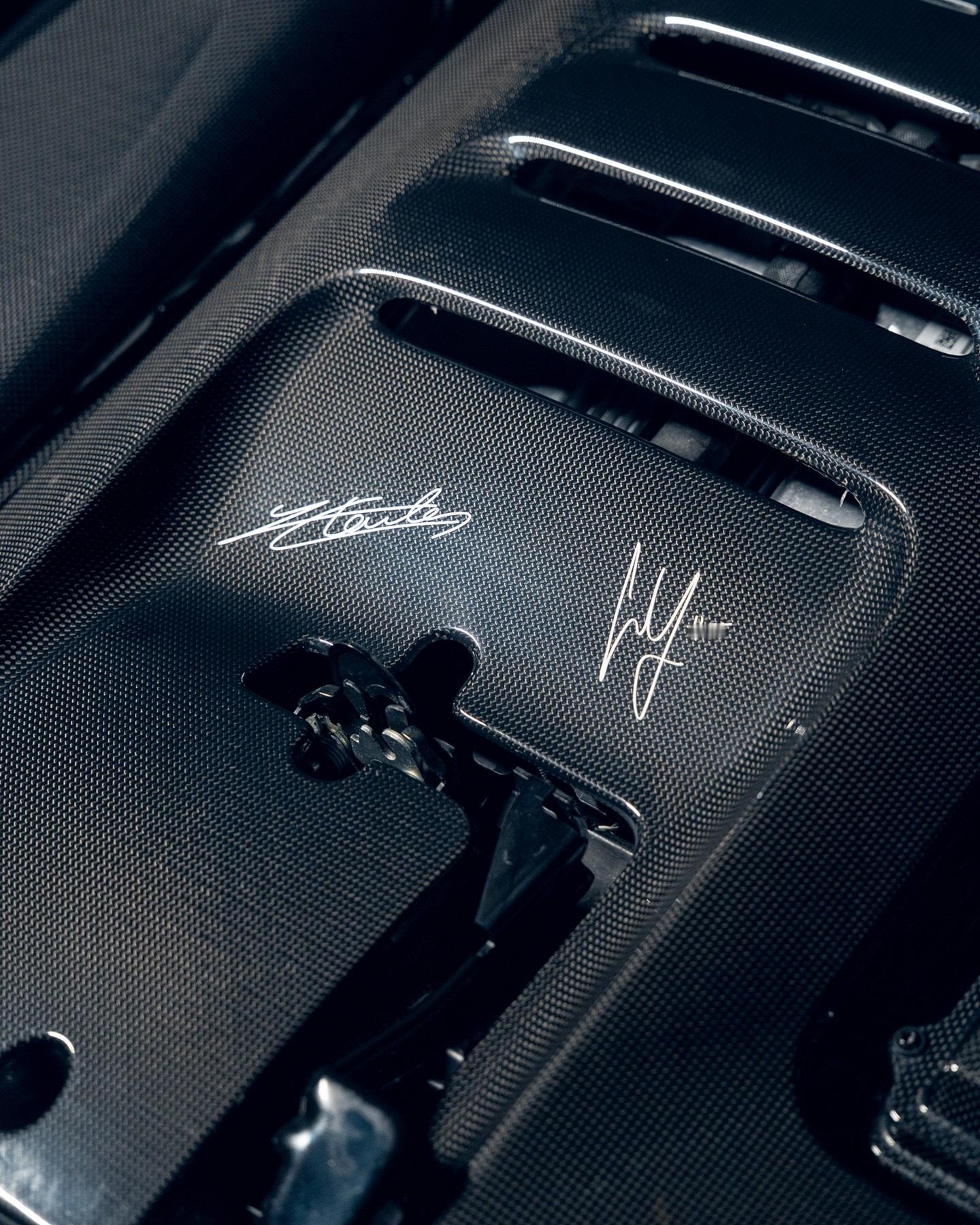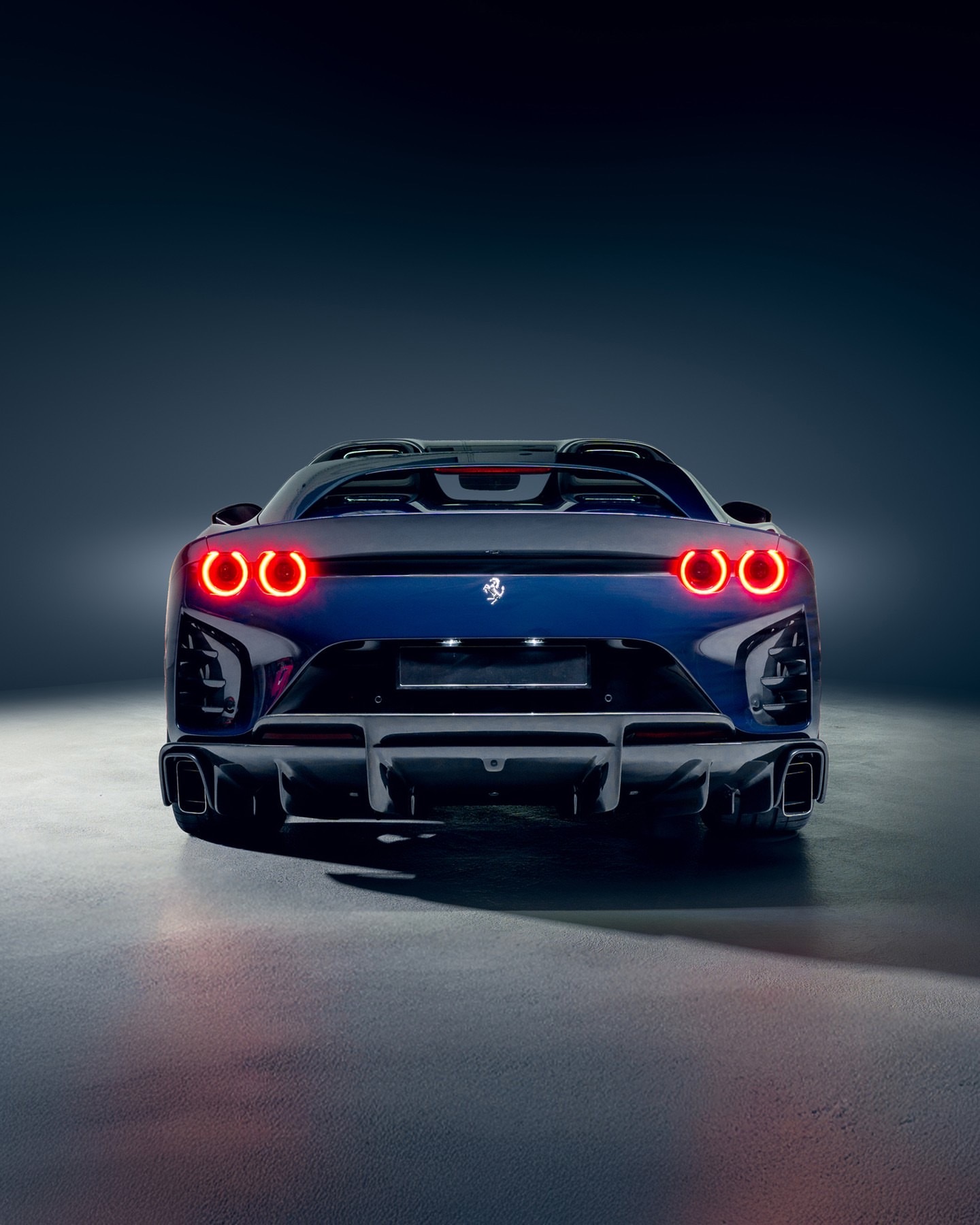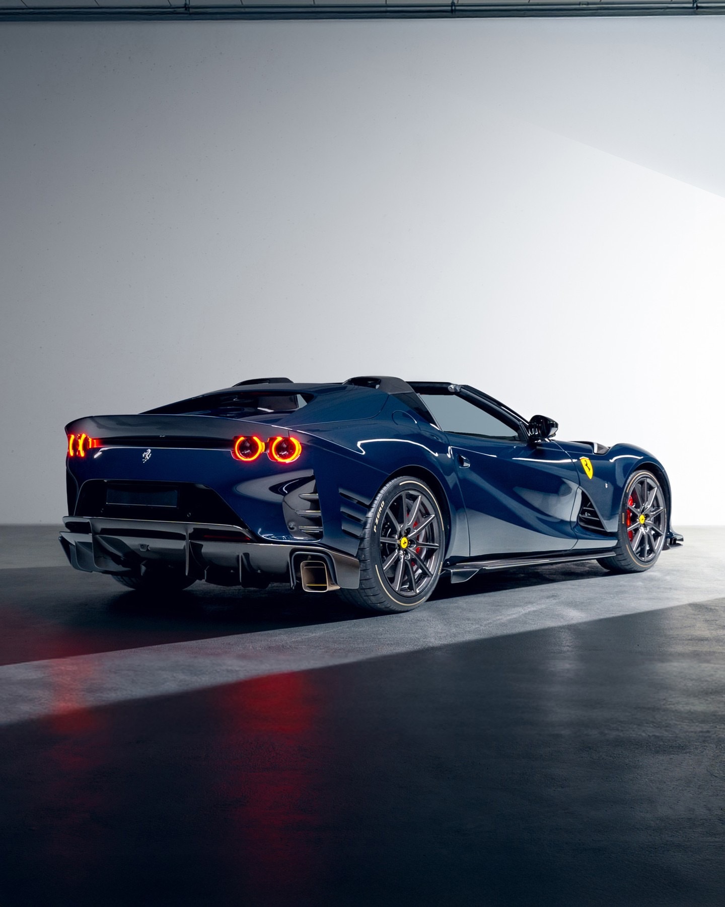 来自《速度定制收藏》的这个例子,以深邃的蓝波兹齐色搭配银色纽博格林装饰、空气刷漆的盾牌和全车碳纤维材质完成。引擎盖下,碳纤维发动机盖承载着法拉利一级方程式车手查尔斯·勒克莱尔和卡洛斯·赛恩兹的银色签名。